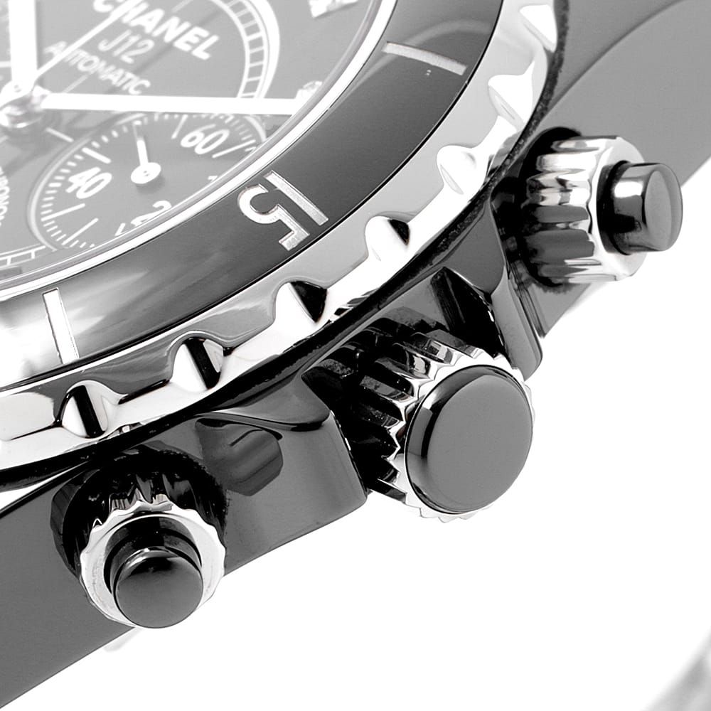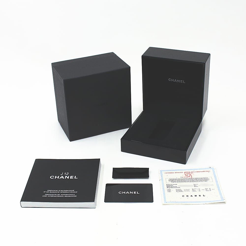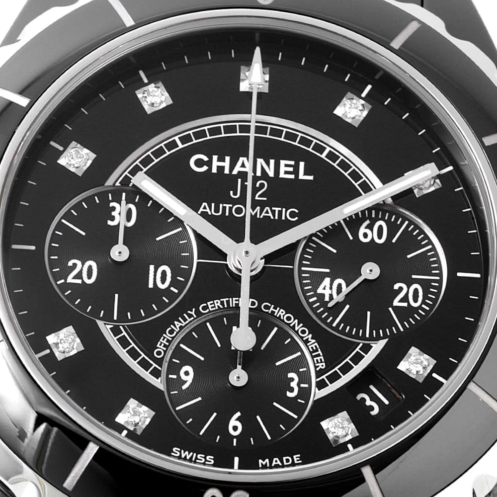 ■モデル情報:シャネル渾身の力作であり、2000年の発表から世界中で人気を博しているJ12コレクション。こちらはインデックスに9ポイントのダイヤをセットしたエレガントなモデルです。材質には高硬度という特性を持つセラミックを使用しているため、傷が付きにくく取り扱いが楽な時計でもあります。200mの防水設計がされており、マリンスポーツにも対応可能です。