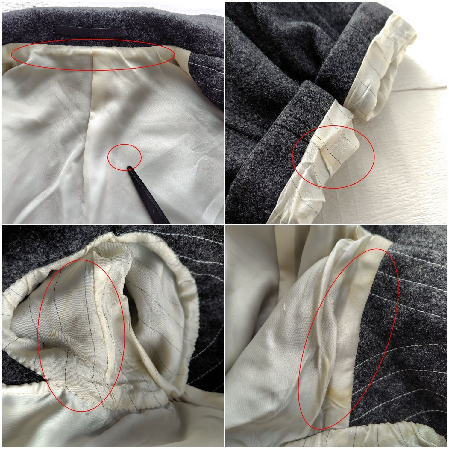 袖口裏、脇下、襟の裏地(白地部分)に汚れ