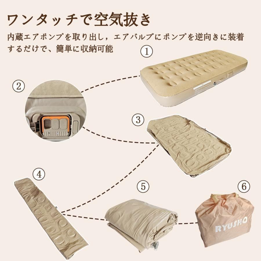 【便利な収納と持ち運び】: キャンプエアーベッドシングルで収納が便利で、使用後は簡単に収納でき、省スペースで持ち運びやすいです。