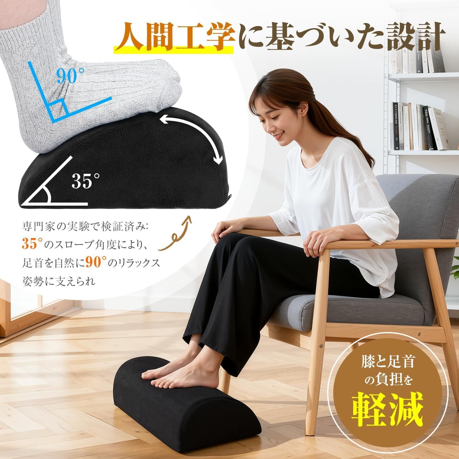 【足裏リラックス専用設計】メモリーフォームの高さ、硬度、角度など重要パラメーターを徹底的にテストし、日本人の足型に最適化された人体工学設計の 35 度支撑型メモリーフォーム足置きを誕生させました。全ての指標が最高基準を満たし、足裏からの深いリラックスを実現します。