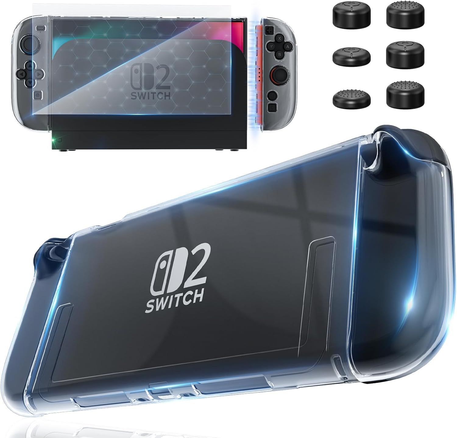 PC製ケース、強化ガラスフィルム1枚、親指キャップがセットになったお得なパッケージです。Switch 2本体とジョイコンを傷や衝撃から守り、長く快適に使用できます。