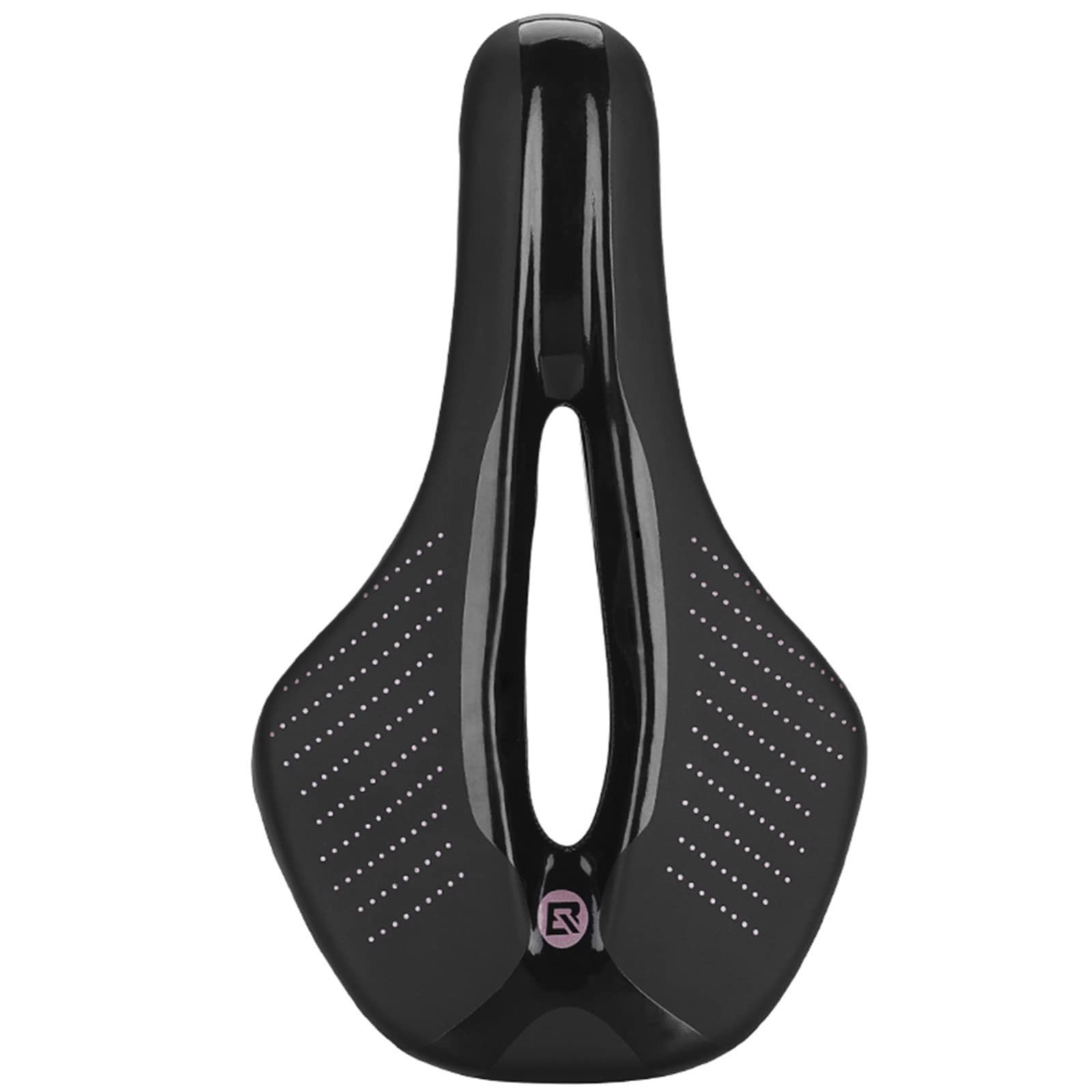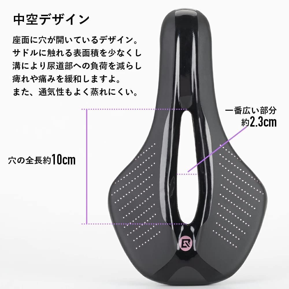 【通気性の穴空きのデザイン】サドル座面の真ん中に穴が空いている、中空デザインです。サドルに触れる面積を少なくし、通気性があります。穴空きと溝により、尿道部への圧迫を軽減。ライド後の痺れや痛みを緩和する効果がありますよ。
