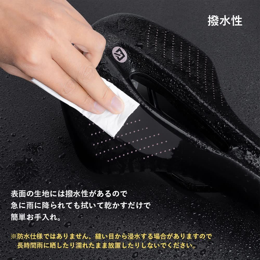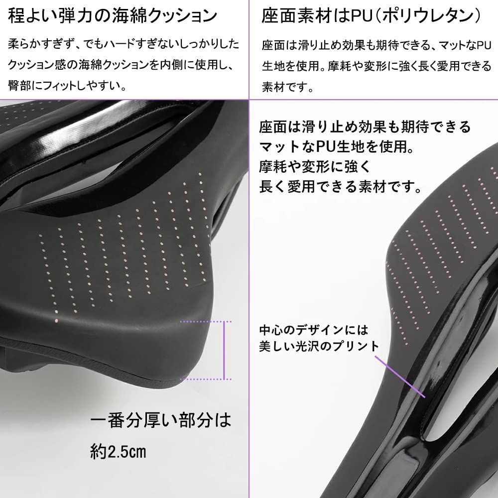 【地面からの衝撃を吸収】幅広でラウンド形状な座面で、安定して長く座れる柔らかい低反発タイプのサドルです。自転車サドルは固すぎず、柔らかすぎないクッション性のしっかりした高密度海綿クッション素材をインナーに採用します。身体の重量や衝撃を和らげてお尻の痛みを軽減してくれます。