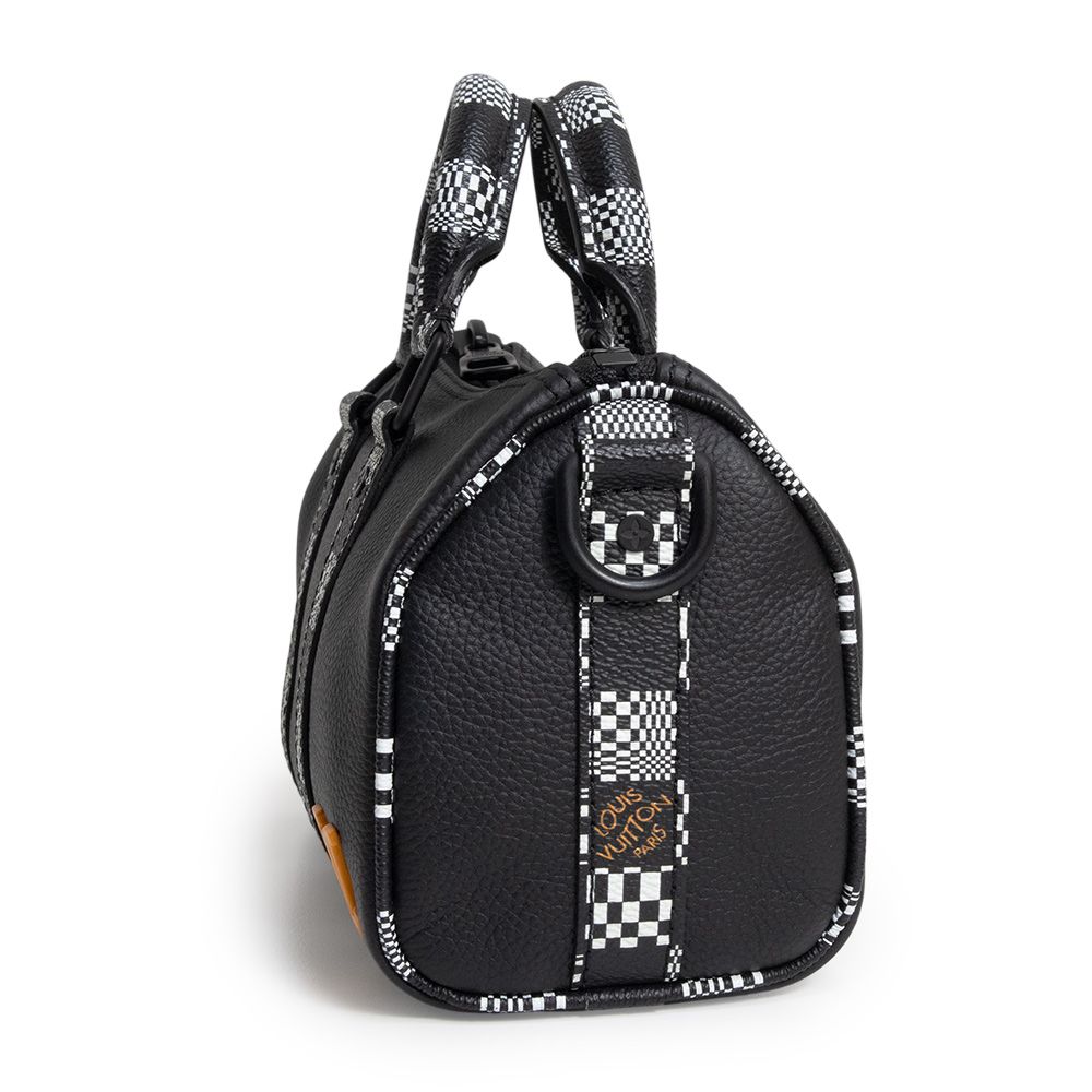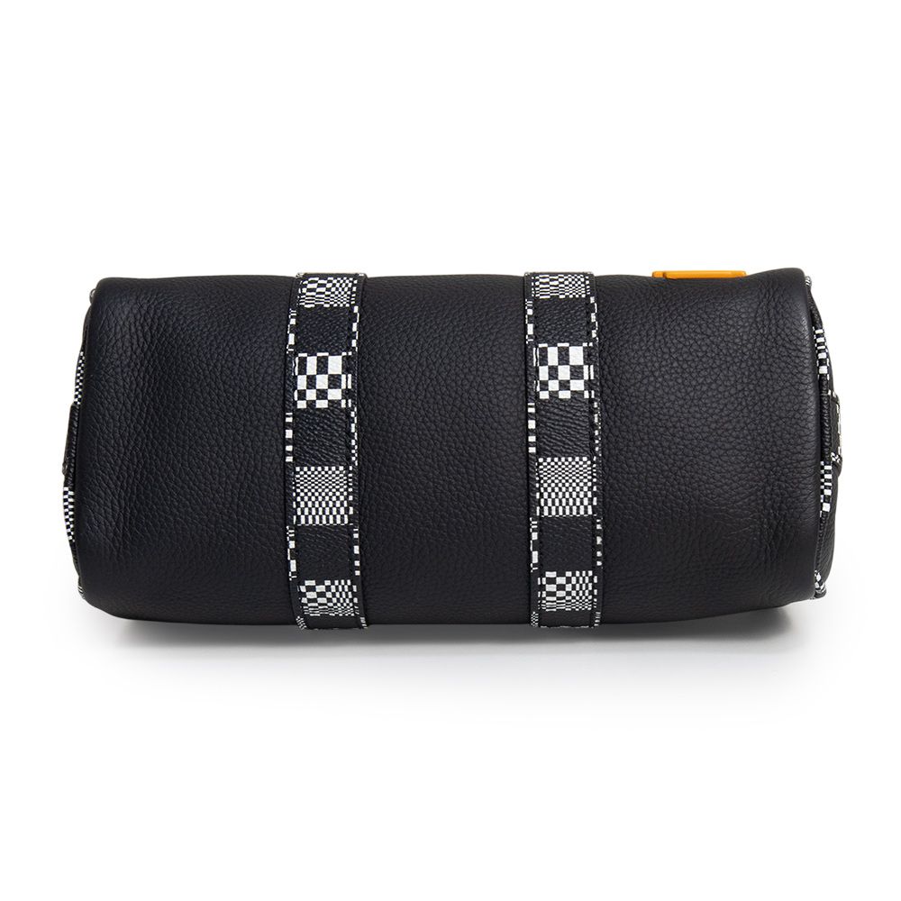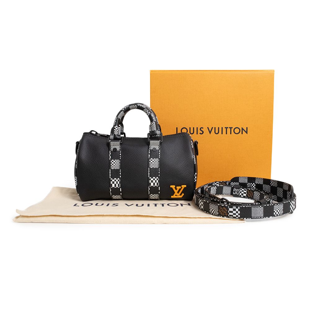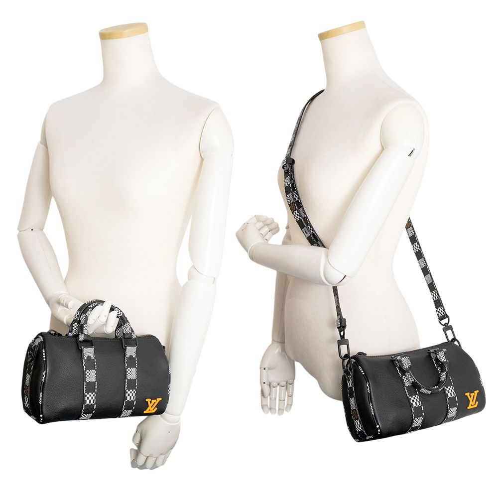 【商品紹介】1930年に発表されたクラシカルなソフトトラベルバッグ「キーポル」を、ヴァージル・アブローがコンパクトに再解釈した「シティ・キーポル」。ブラックのグレインレザー、ボディバンド、2本のトップハンドル、取外し可能なダミエ・ディストーテッド キャンバス製のストラップを添えられています。サフランオレンジのLV イニシャルが個性を放ちます。