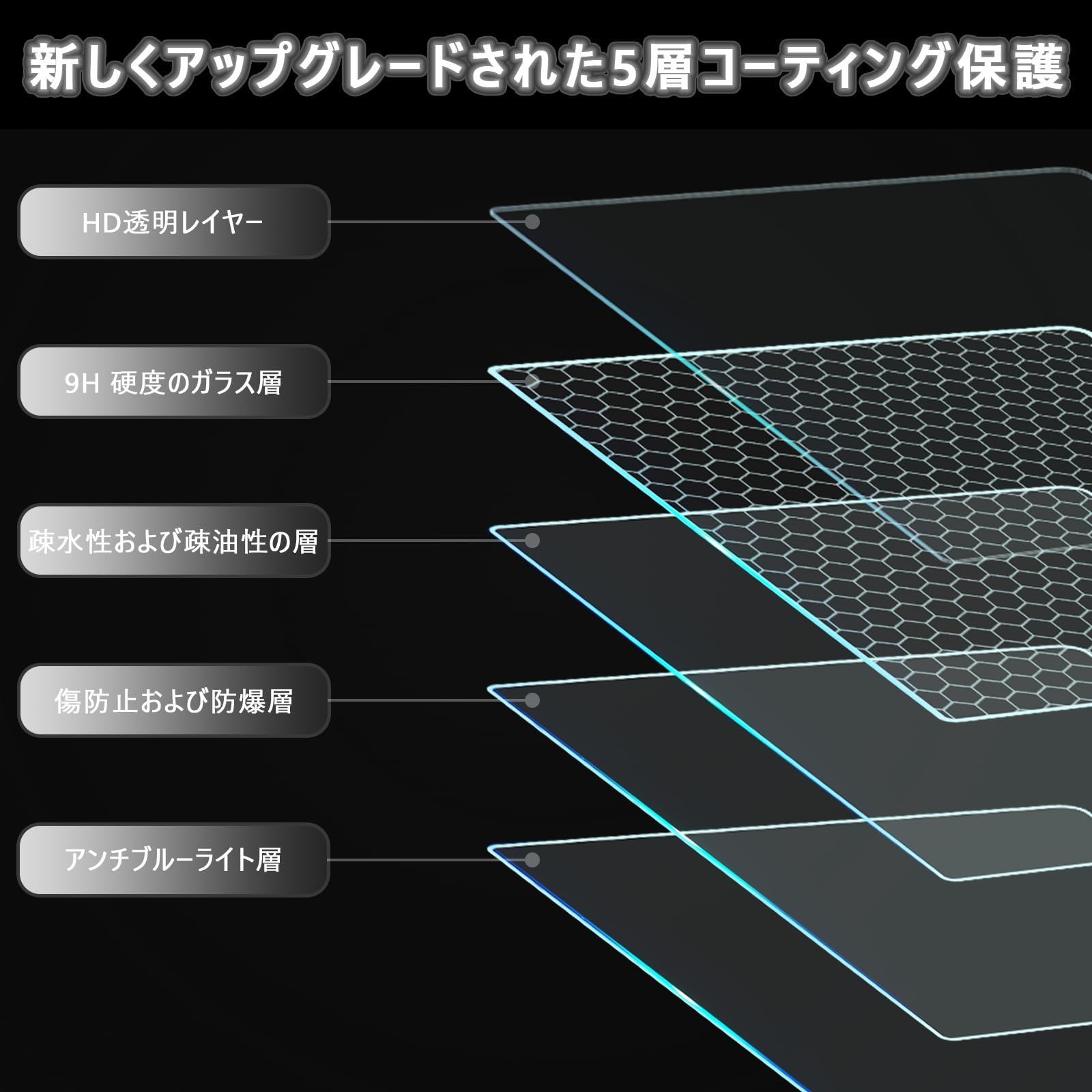 [傷防止と飛散防止] 保護フィルムは9H硬度ガラス製で、高い硬度と耐衝撃性を備えています。表面にしっかりとフィットし、タブレットをしっかりと保護します。ガラスフィルムは傷に強く、ナイフや鍵などの鋭利な物が誤ってタブレットを傷つけるのを防ぎます。日常使用中に割れた場合でも、表面の飛散防止コーティングがガラスの破片を吸収し、飛び散りを防ぎます。