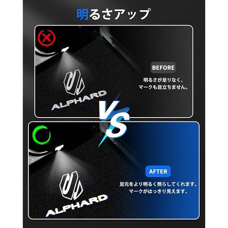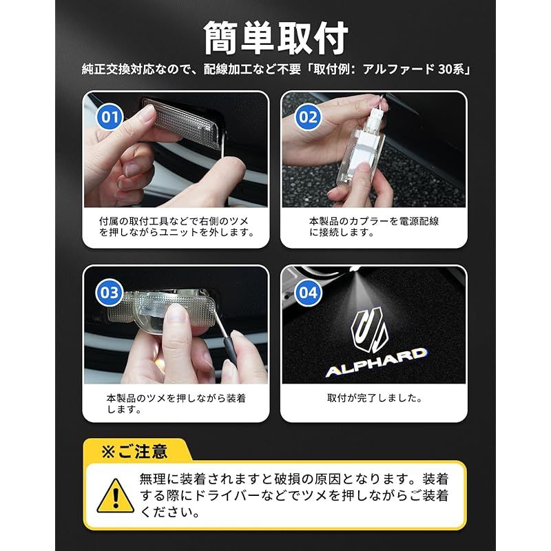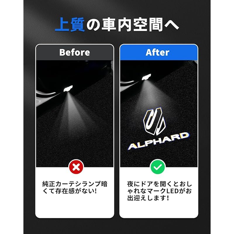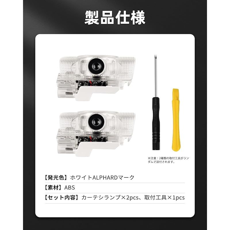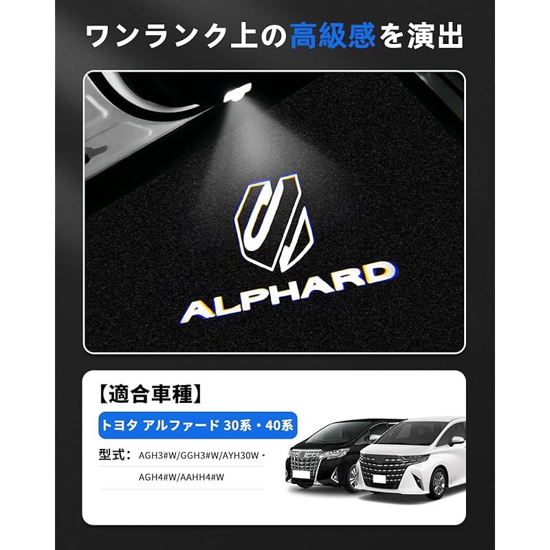 1.【適合車種】トヨタ アルファード ALPHARD 30系; 型式:AYH/GGH/AGH30・35W 年式:H27.1~; トヨタ アルファード ALPHARD 40系; 型式:AGH4#W/AAHH4#W;年式:2023年6月~現行;セット内容:カーテシランプ×2pcs、取付工具×1pcs。