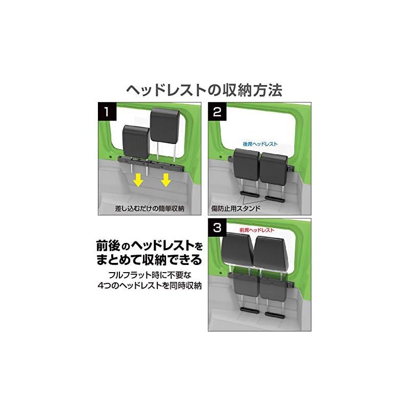 車中泊等フルフラット化の際に取外した前席と後席ヘッドレストをまとめて収納可能