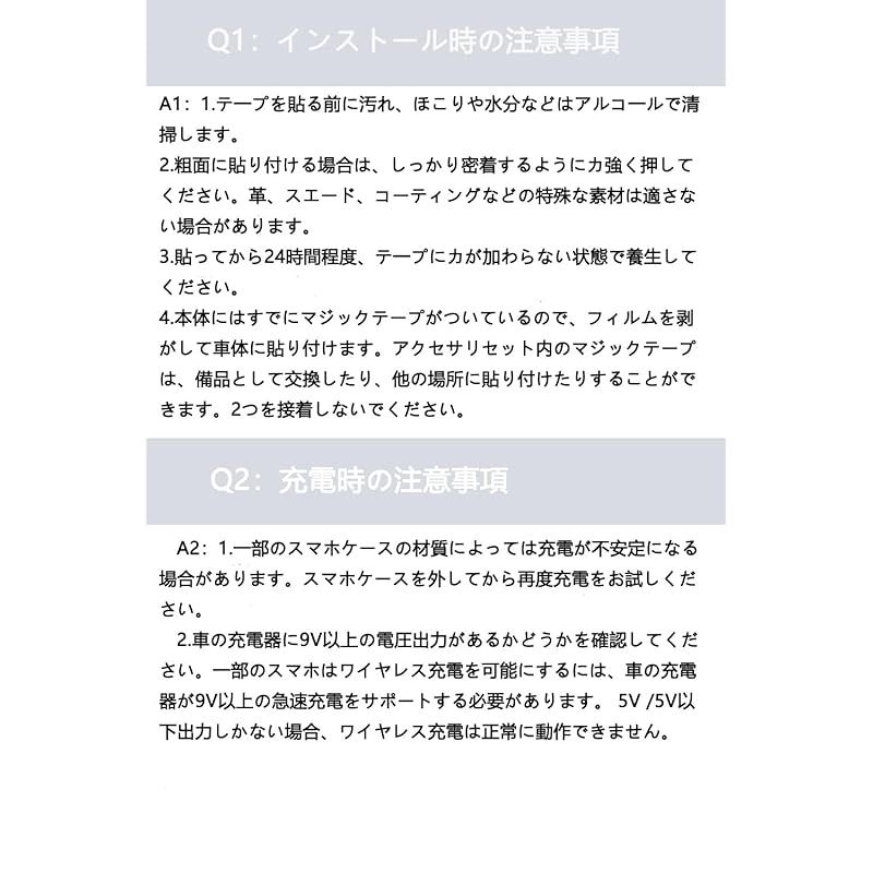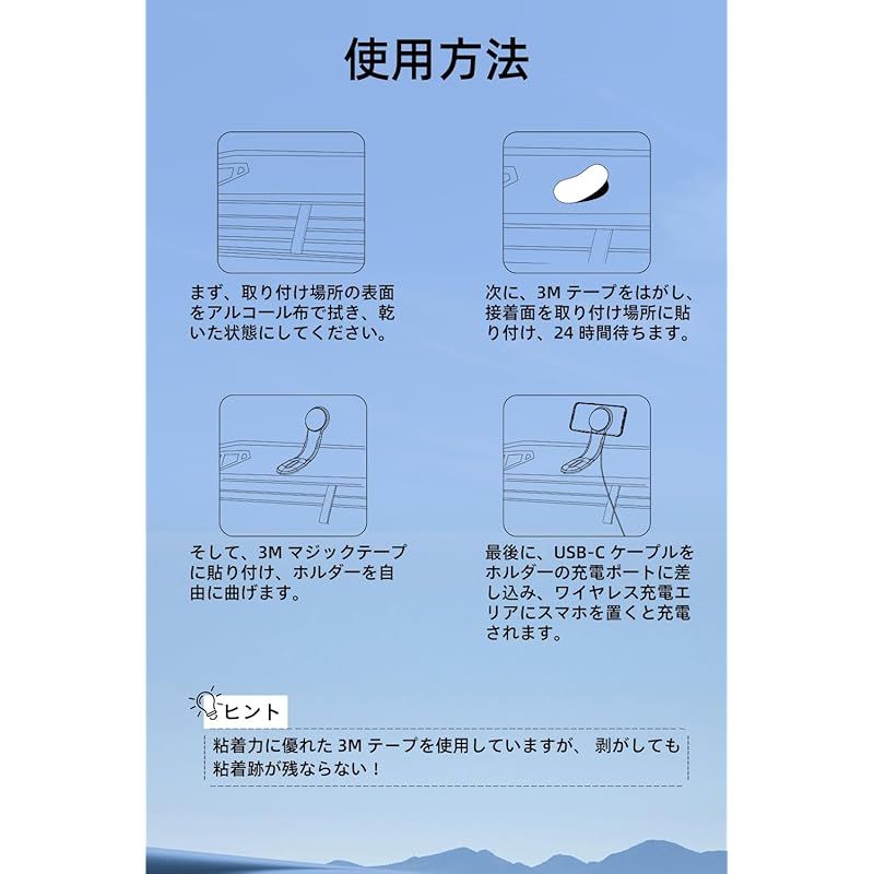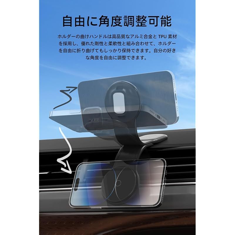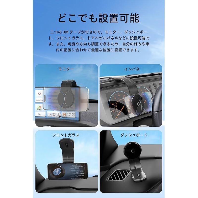 幅広い互換性:テープを使用するため、車内のダッシュボードやモニターなど平らな表面に取り付けることができます。運転の習慣により適合な位置を選んできます。また、Magsafe対応のスマホ(iPhone 12シリーズ以降)はホルダーを置くで直接に充電可能だけではなく、付属のメタルプレ一トまたはMagsafeアクセサリ一を利用して、Magsafe機能ないのAndroidスマホも使用可能です。※Magsafeスマホケースを使用した場合は付属のメタルプレ一トを使用しないでください。