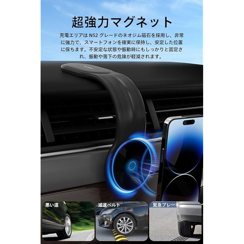 最大15W出力可能:吸着エリアはワイヤレス充電技術を搭載しており、5W/7.5W/10W/15Wの出力に対応します。最大15Wの高出力でスマホへ急速充電できるホルダーです。スマホがホルダーを置くだけですぐに充電可能で、運転中でも快適に充電できます。※ワイヤレス充電対応できるスマホに適用します。【ご注意:車の充電器に9V以上の電圧出力があるかどうかを確認してください。一部のスマホはワイヤレス充電を可能にするには、車の充電器が9V以上の急速充電をサポートする必要があります。5V 出力しかない場合、ワイヤレス充電は正常に動作できません。】
