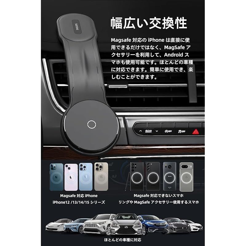 商品名:Philips (フィリップス) 車載スマホホルダー マグネット magsafeホルダー 15W急速充電 携帯ホルダー 自由調整 超強力吸着 片手操作 車用ホルダー 3M粘着テープ 繰り返し利用可能 カー用品 全機種対応 DLK2301Q