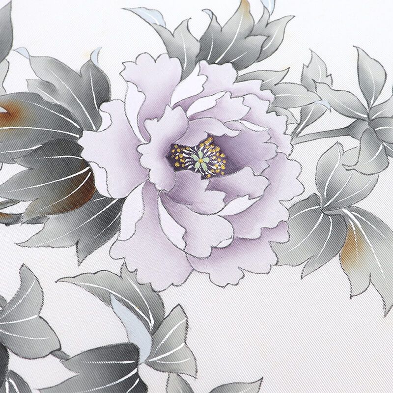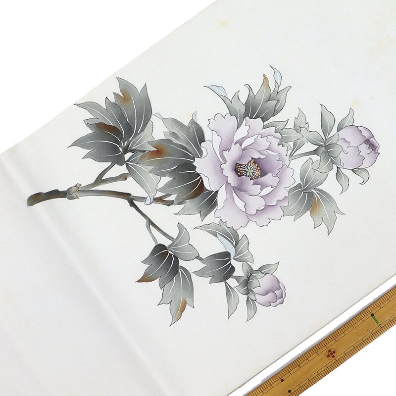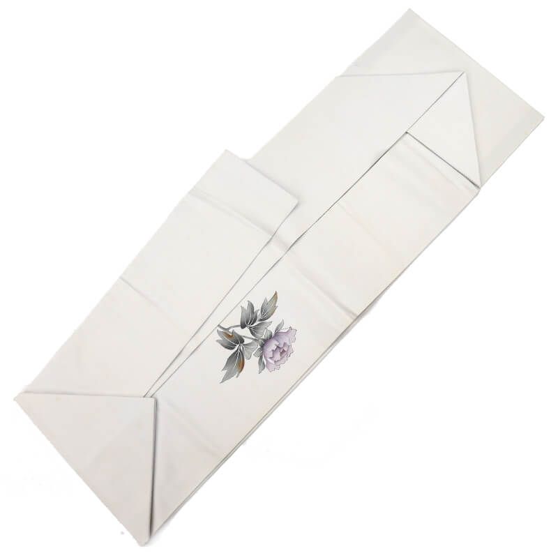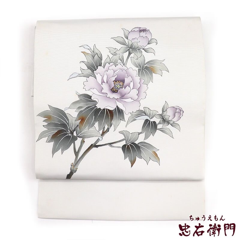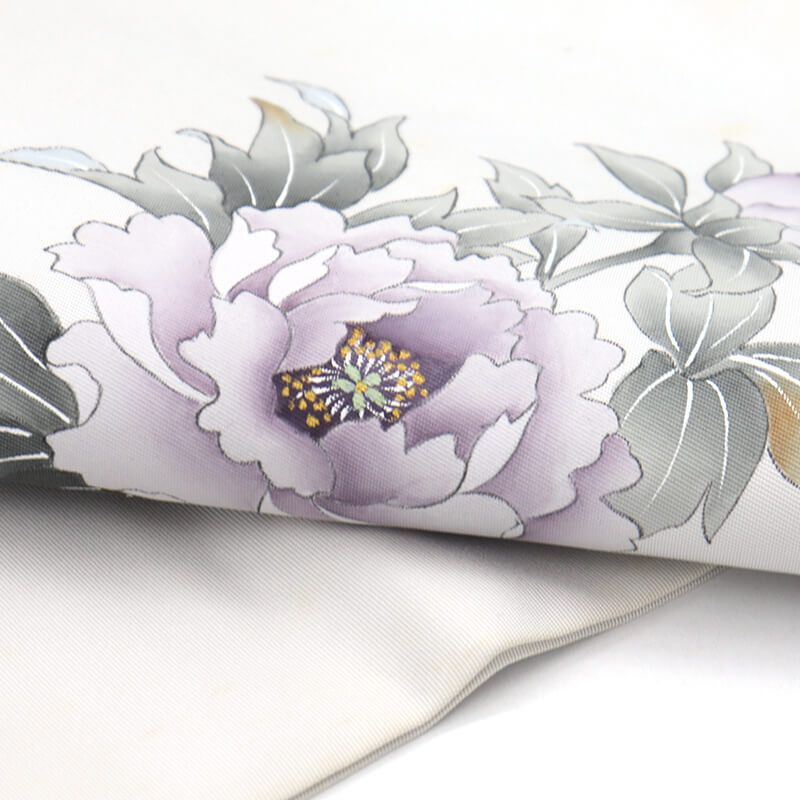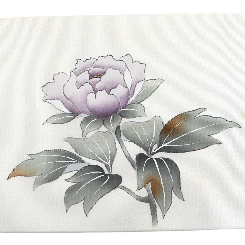 柔らかな華やかさのあるグレーに、 紫をベースに芍薬が表現された名古屋帯。 品の良い華やぎ感が魅力です。汚れがある為、練習用などに適しております。