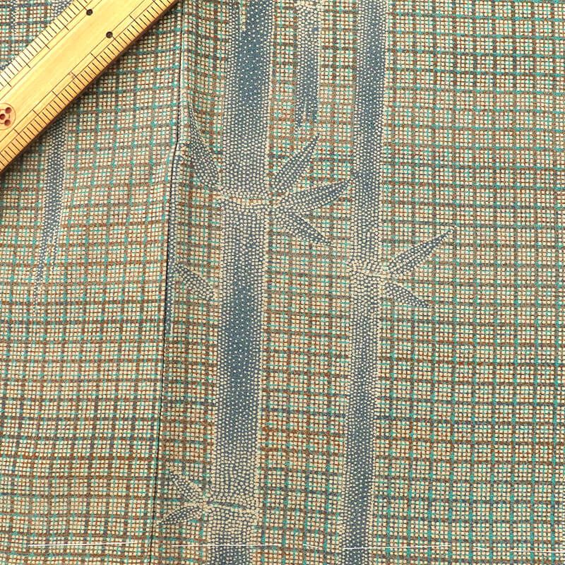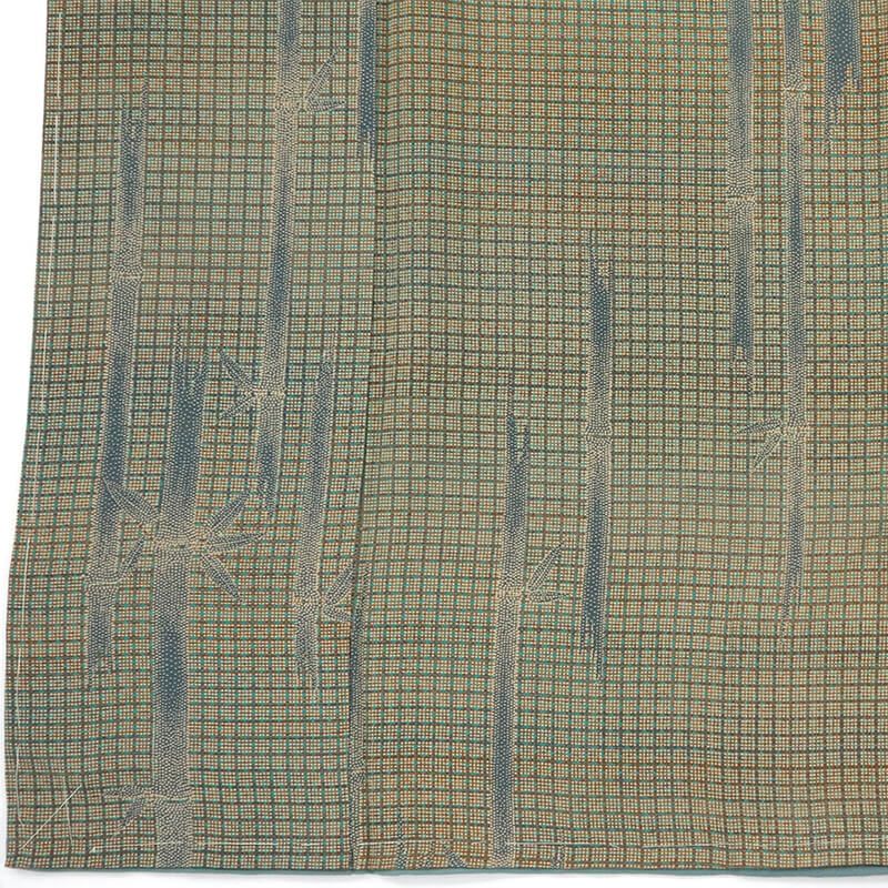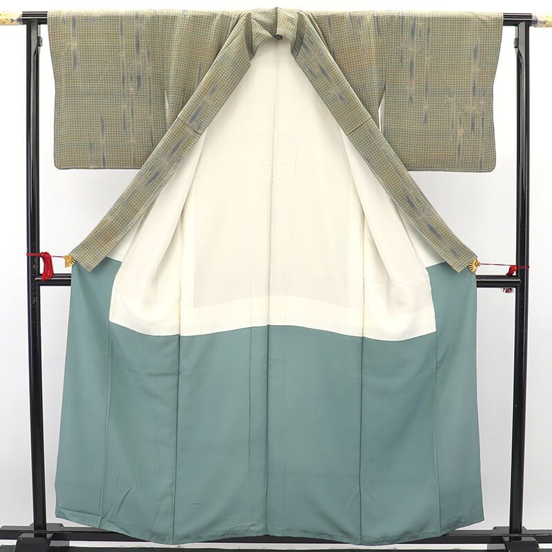 上品な灰緑の小紋。四角柄に、すらりと伸びる竹の柄が表現されたおしゃれさのある一枚です。 柔らかな和の色合いが、 上品な着こなしを実現します。