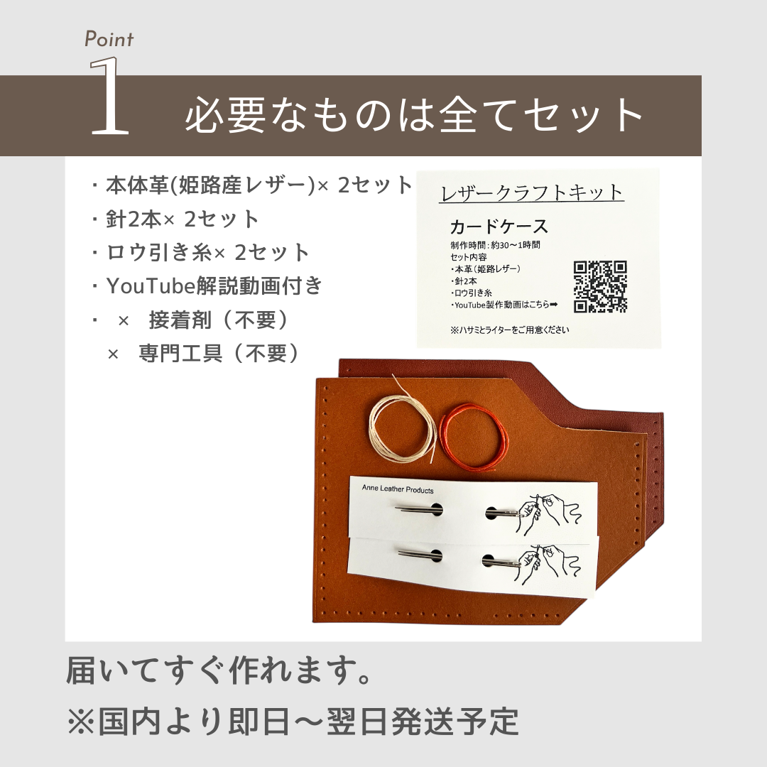【商品詳細】 素材:牛革(姫路レザー)、ロウ引き糸 / セット内容:レザーパーツ(2セット分)、縫い針、糸、作り方動画QRコード / 生産国:日本(Made in Japan) / 完成サイズ:約10cm×6.5cm