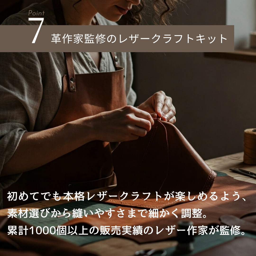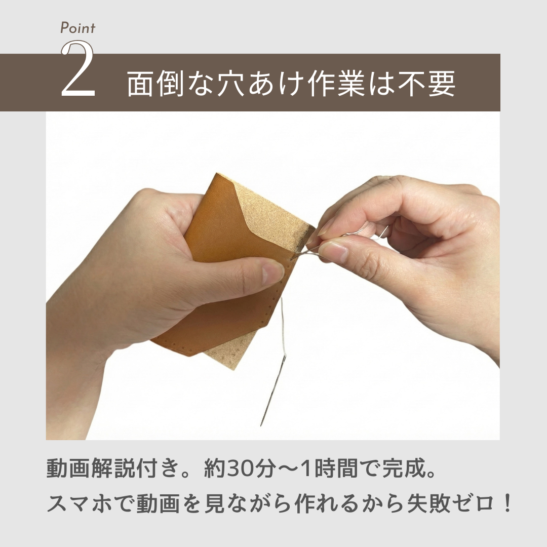 【初心者でも安心の動画解説付き】 面倒な型紙作りや革の裁断は一切不要。穴あけ済みのレザーと、丁寧な「制作解説動画」がセットになっているので、初めての方でも迷わず、約30分〜1時間で完成させられます。