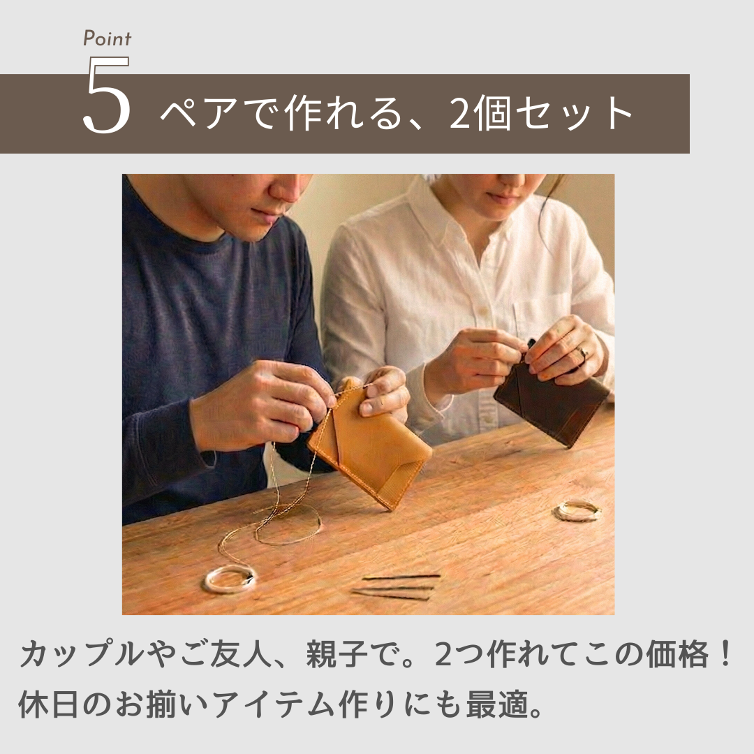 【お得なペアセット(2個入り)】 恋人やご夫婦、親子で一緒に楽しめる2個セット。単品で揃えるよりもお得で、届いたその場からすぐに二人でレザークラフト体験を始められます。