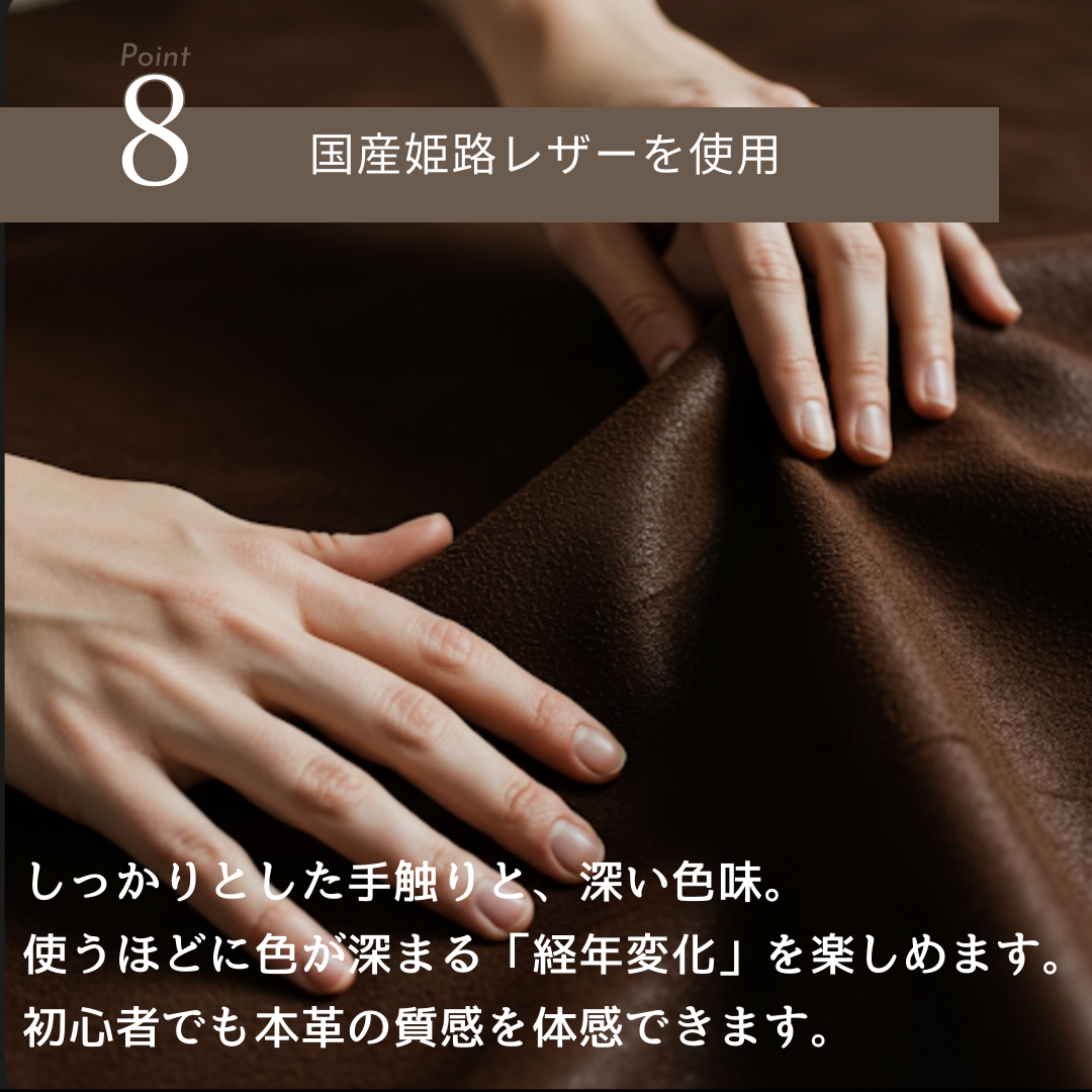 素材には、日本を代表する革の産地「姫路」のタンナー(製革業者)が丹精込めて仕上げた本革を使用しています。