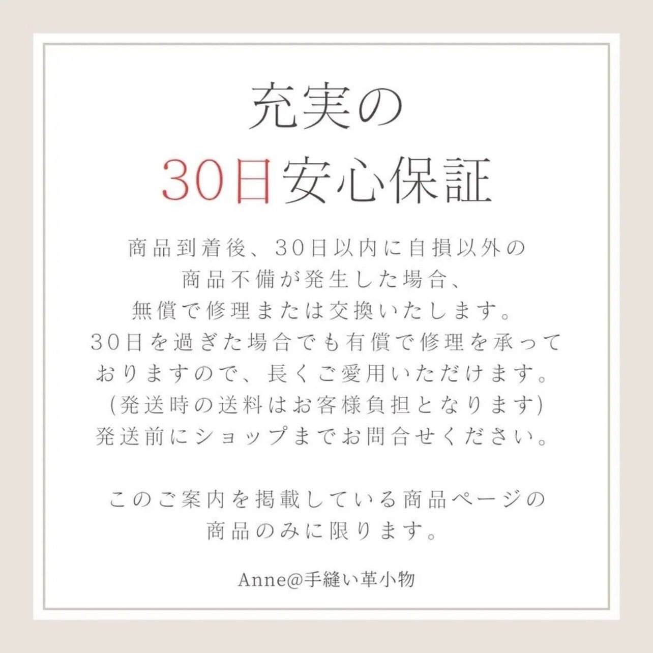 商品到着後、30日以内に自損以外の不備が発生した場合、無償で修理または交換いたします。