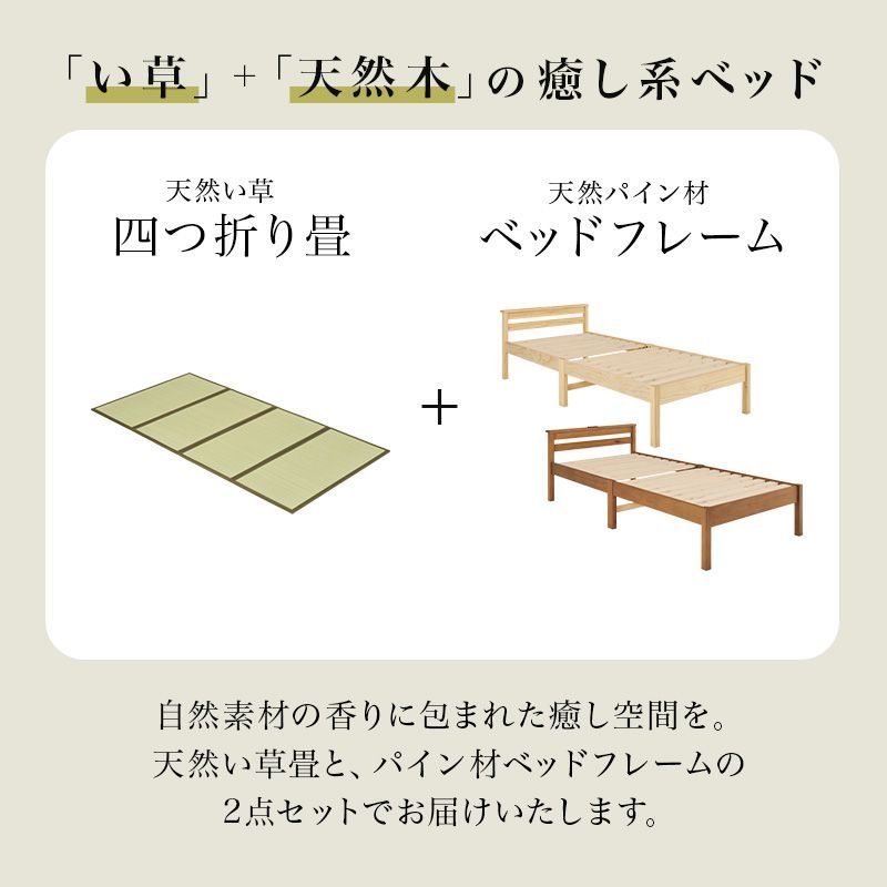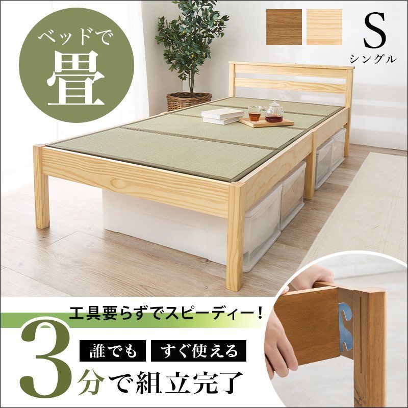 ネジなし、工具不要で簡単組立。爽やかな天然い草を使用した畳マットをすのこベッドに合わせました。スマートフォンなどの充電やライトの取り付けに便利な宮棚とコンセント付き