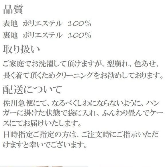 佐川急便にて、なるべくしわにならないように、ハンガーに掛けた状態で袋に入れ、ふんわり畳んでケースにてお届けいたします。