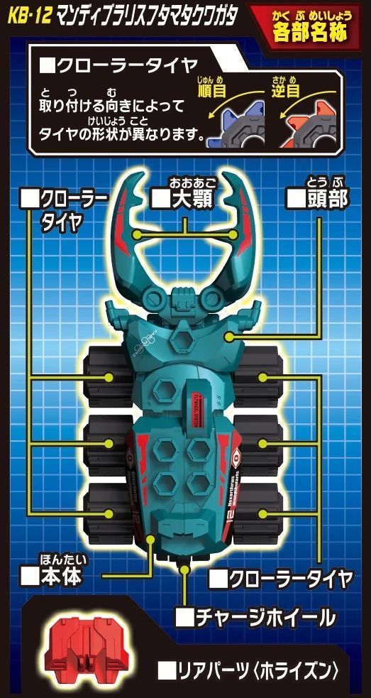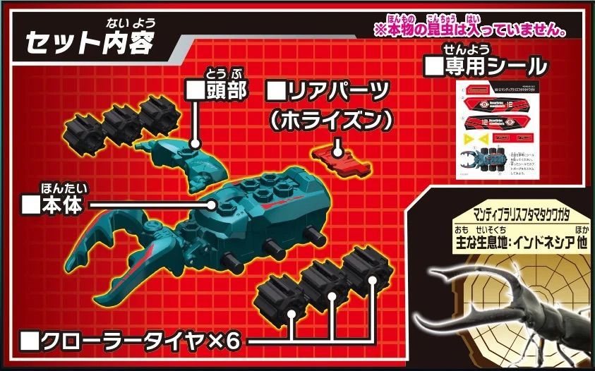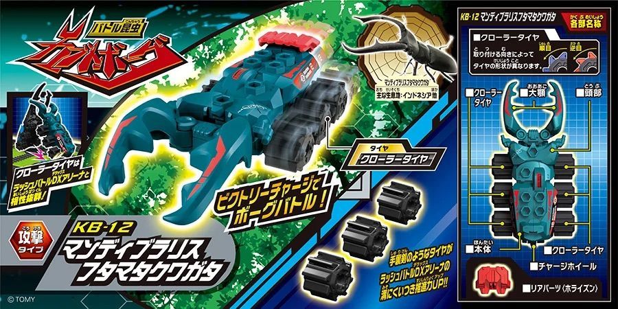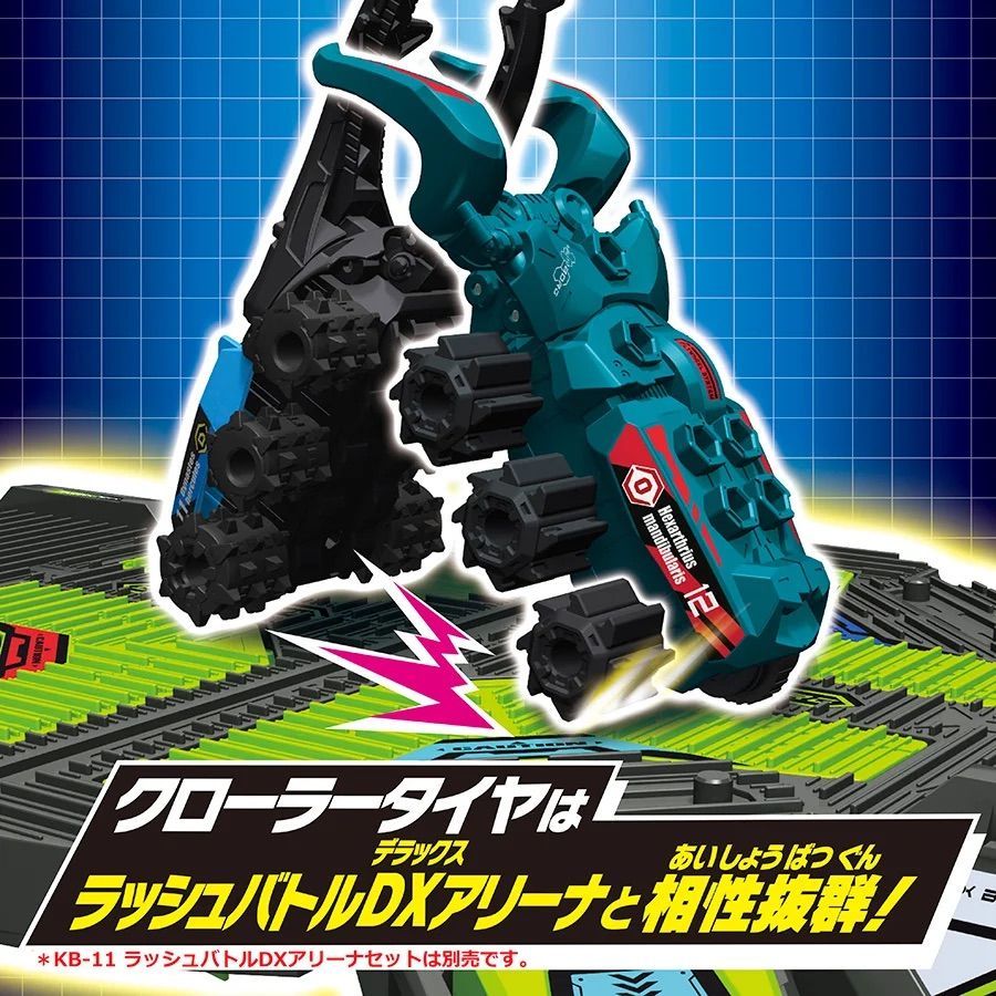 大人気「マンディブラリスフタマタクワガタ」が新型タイヤ/新カラーで登場!手裏剣のような新型タイヤ「クローラー」は「ラッシュバトルDXアリーナ(別売)」との相性は抜群!フィールド溝にくいつき推進力アップ!!