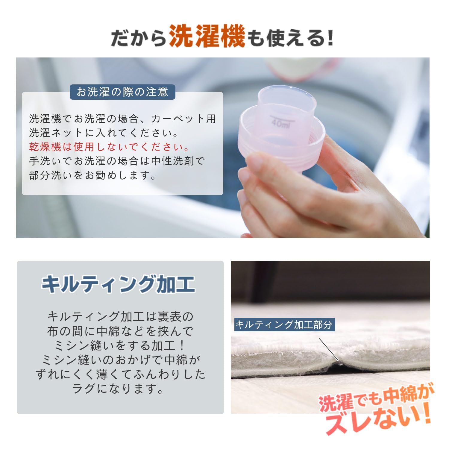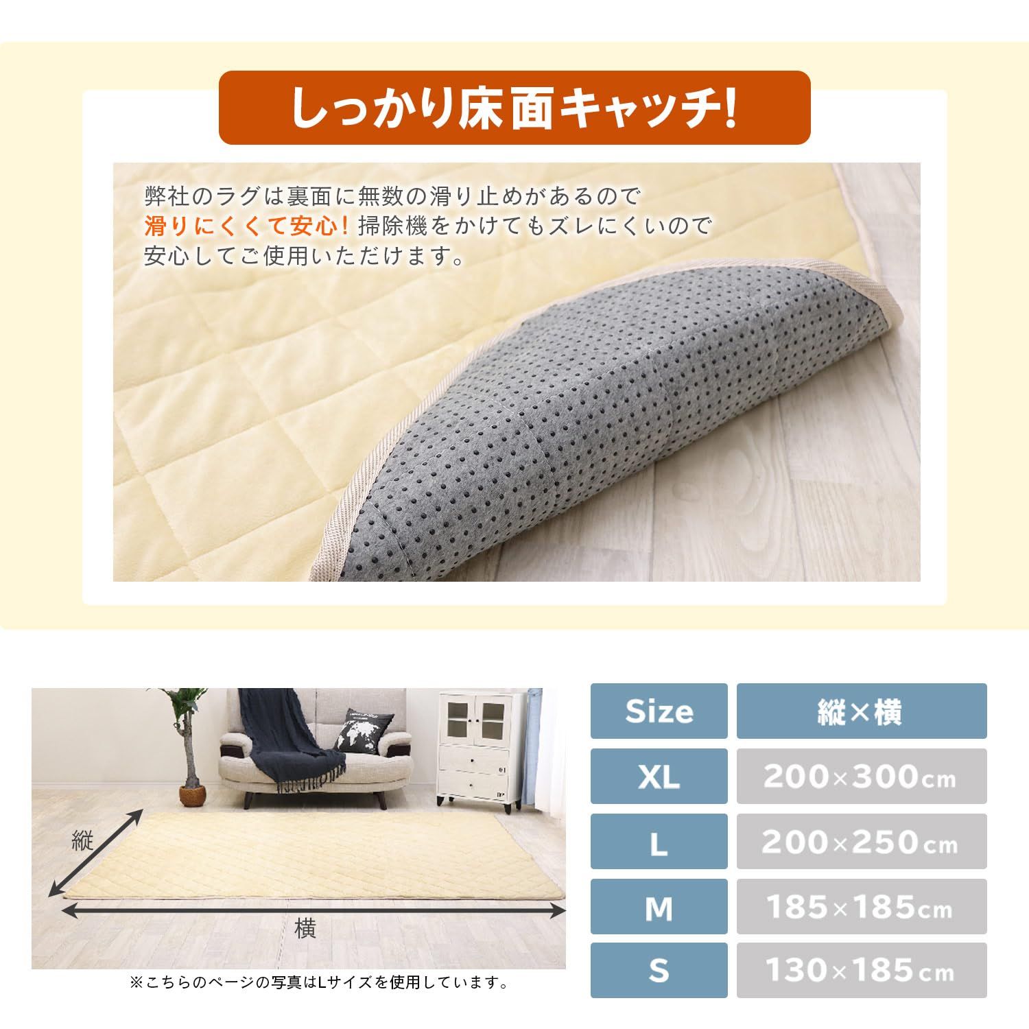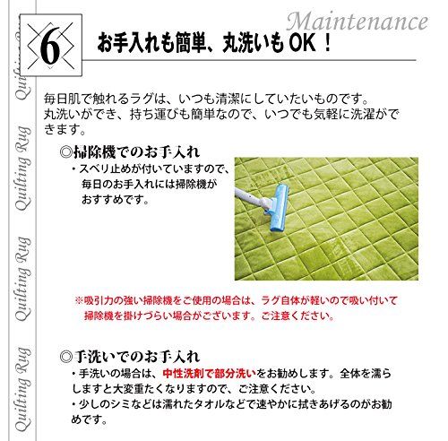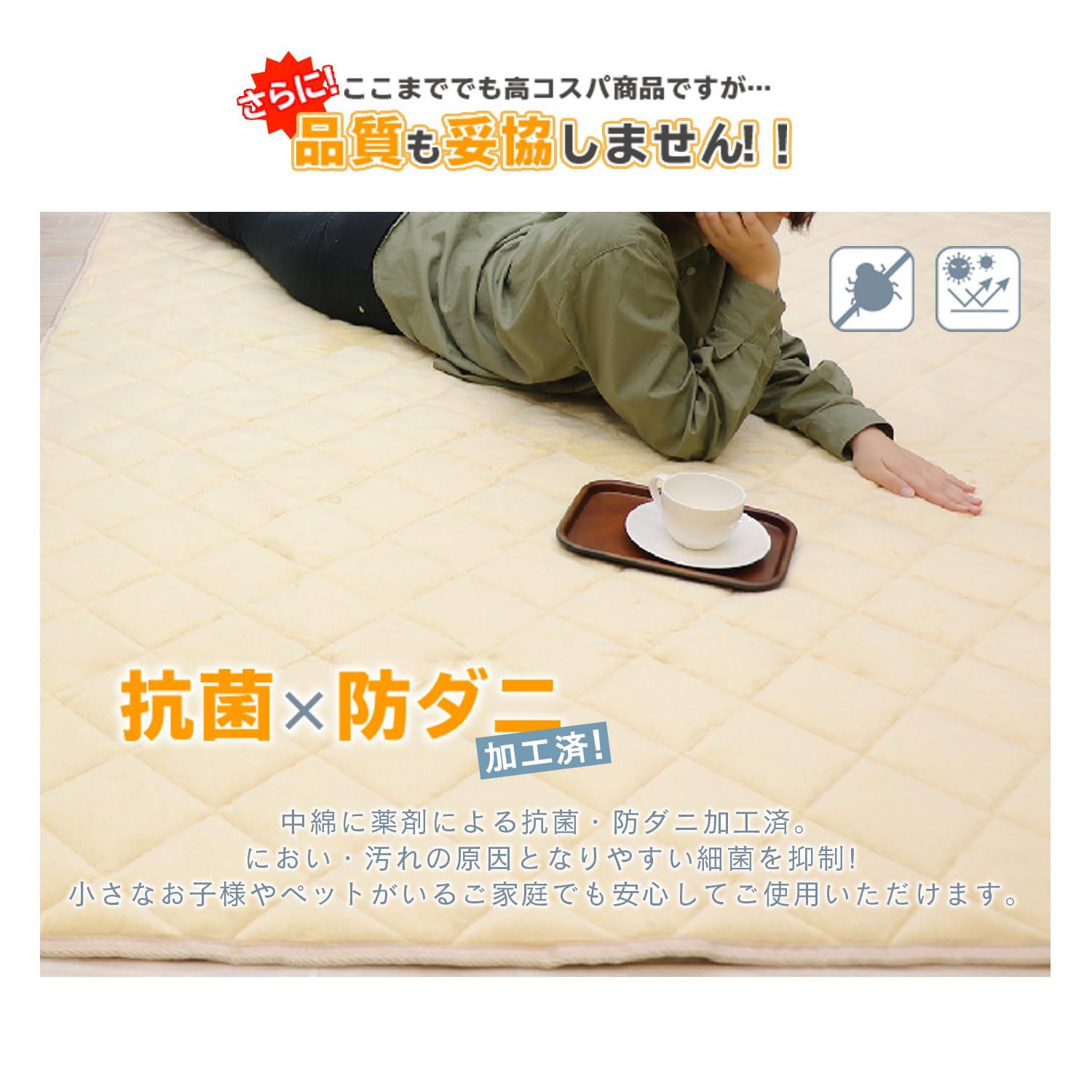 【抗菌・防ダニラグ】サイズ:185×185cm 表地:ポリエステル100% パイル長さ:約5mm 中材:抗菌・防ダニ中綿とウレタンフォーム約8mm 裏面:不織布(滑り止め加工) ずれにくいキルティング加工