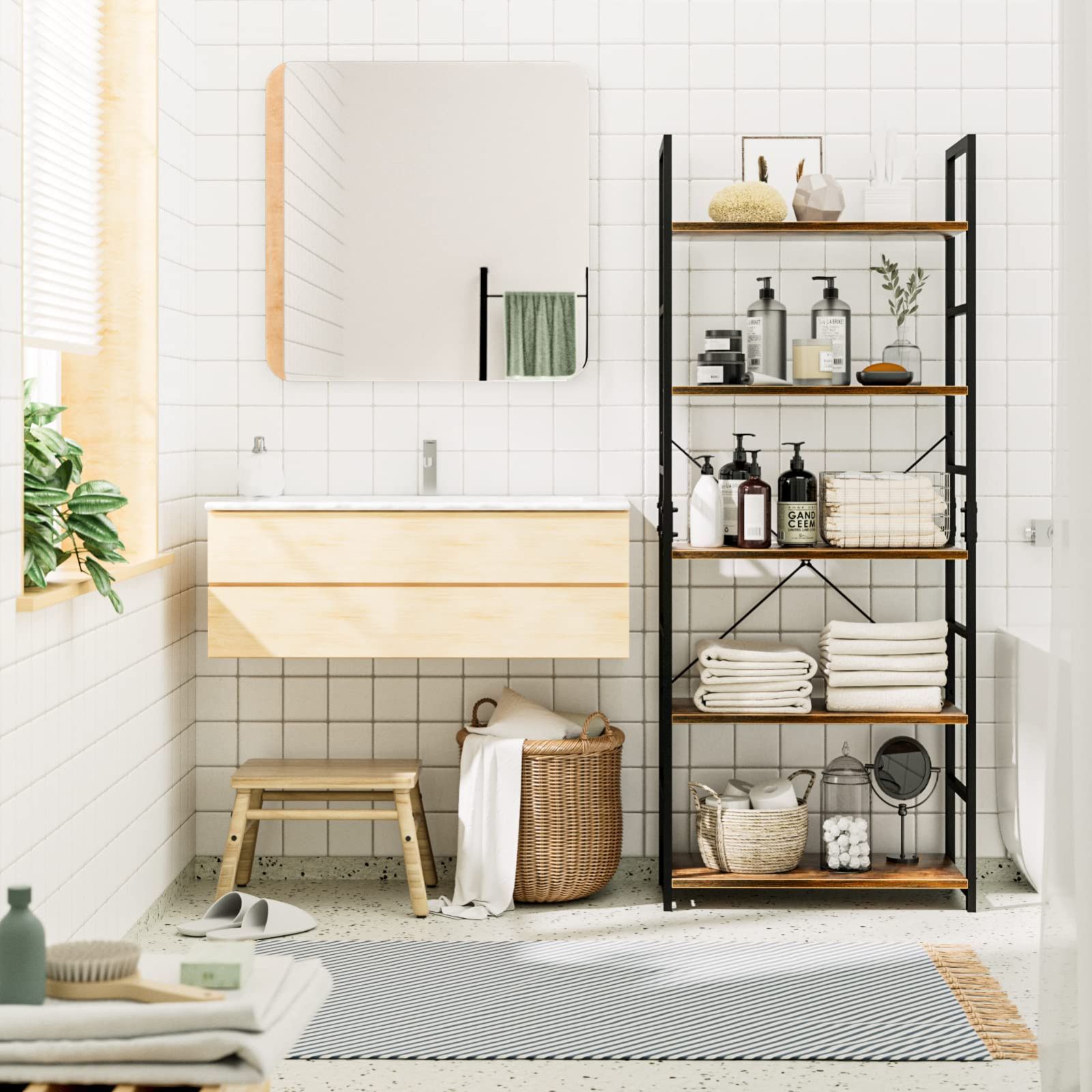 【高品質な金属製フレームと背面補強】高品質な金属とプラスターボードで作られたモダンな金属製のラックは安定性に優れています、頑丈で耐久性があります。最上級の防錆コーティングにより、ラック全体がよりおしゃれに見えます。高品質な金属製フレームと背面補強により、ラックの棚板一枚あたり23kgの耐荷重を持ち、背面の金属製クロスバーはラックをしっかり補強、重さのある生活用品を置いても大丈夫です。揺れたり、落下の心配はありません。