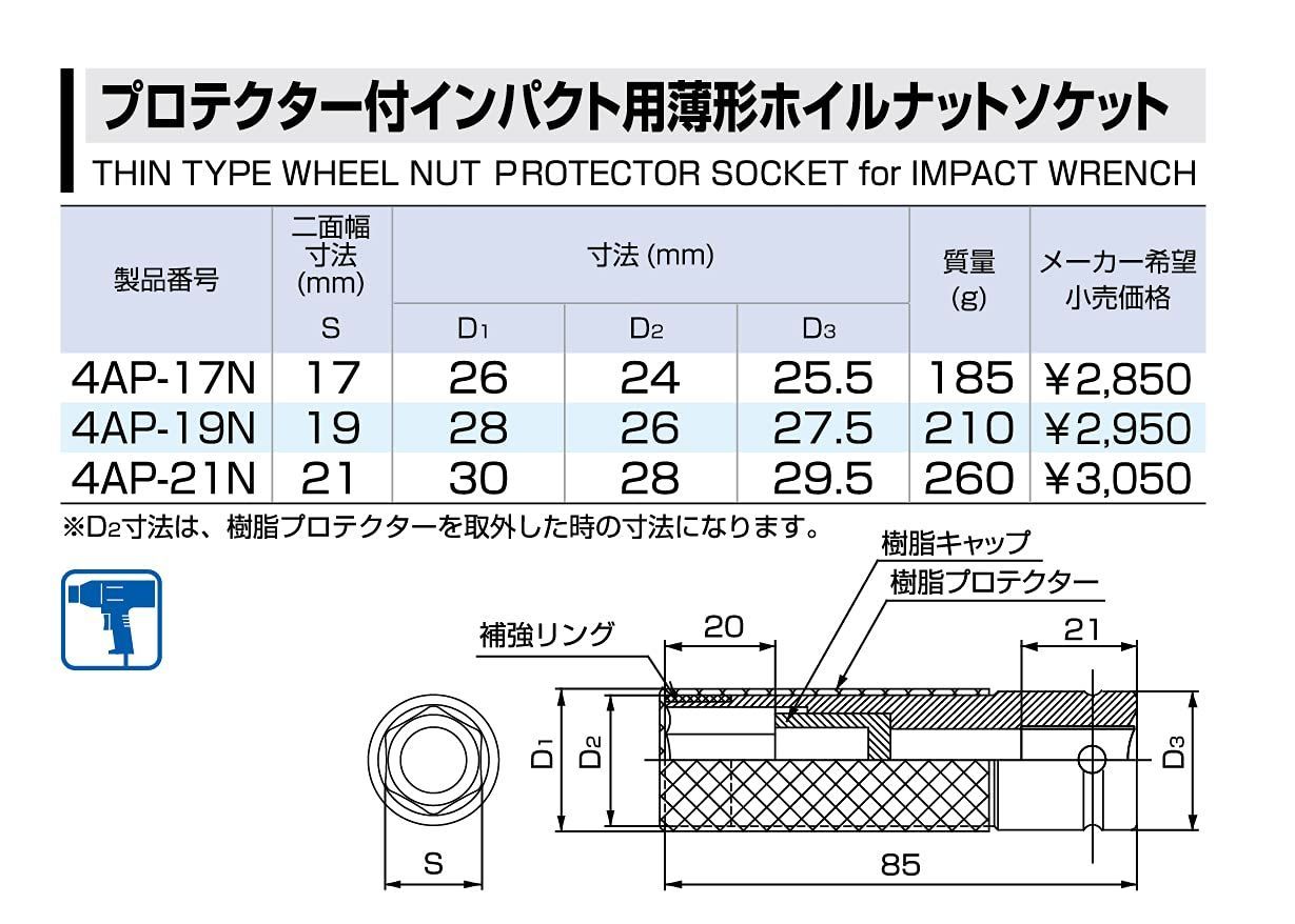 トネ(TONE) プロテクター付インパクト用薄形ホイルナットソケット 4AP-19N 差込角12.7mm(1/2) レッド 二面幅19mm