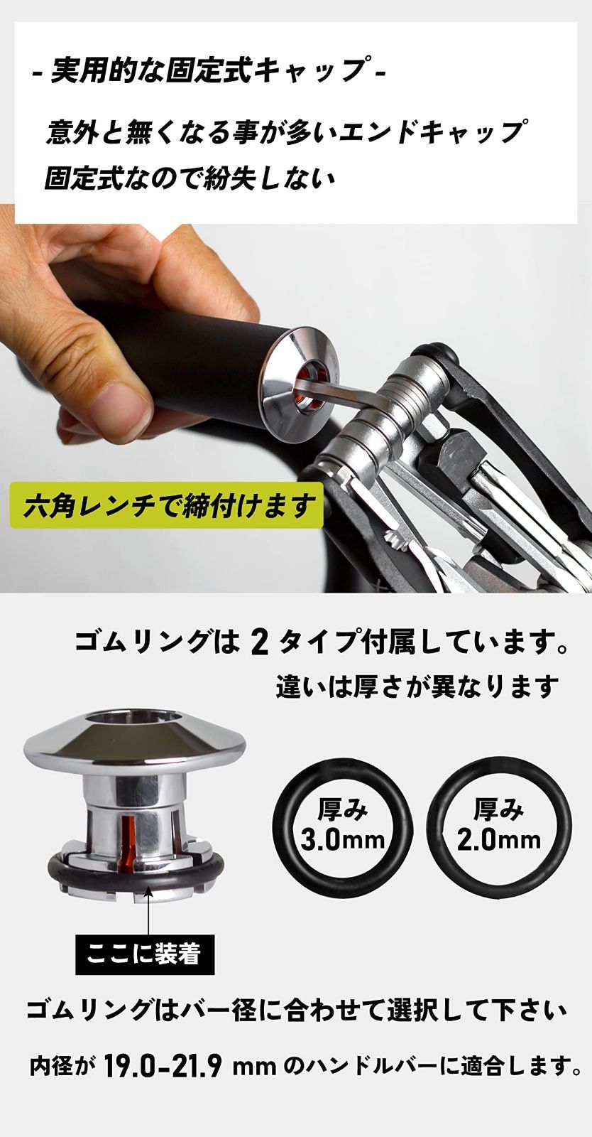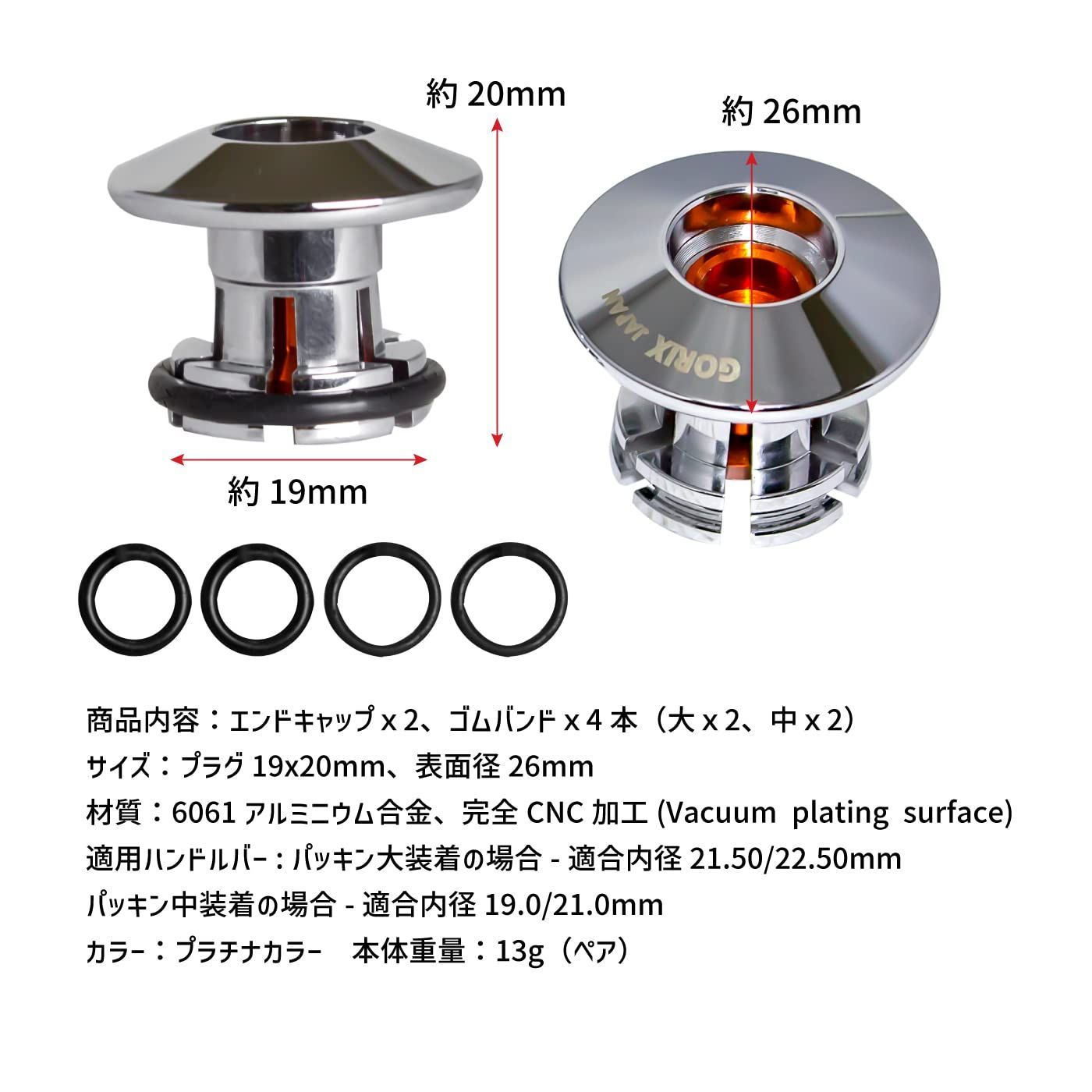 【商品内容】:エンドキャップx2、ゴムバンドx4本(大x2、中x2)【サイズ】:プラグ19x20mm、表面径26mm【本体重量】:13g(ペア)【材質】:6061アルミニウム合金、完全CNC加工(Vacuum plating surface)【適用ハンドルバー】:パッキン大装着の場合-適合内径21.50/22.50mm/パッキン中装着の場合-適合内径19.0/21.0mm【カラー】:プラチナカラー
