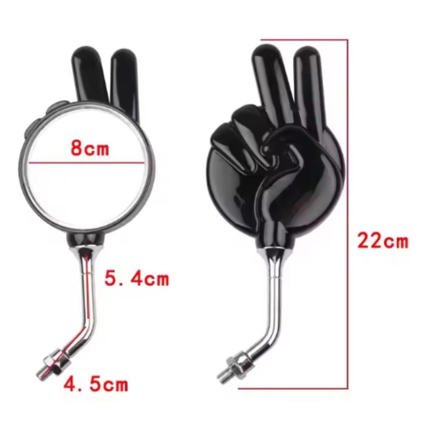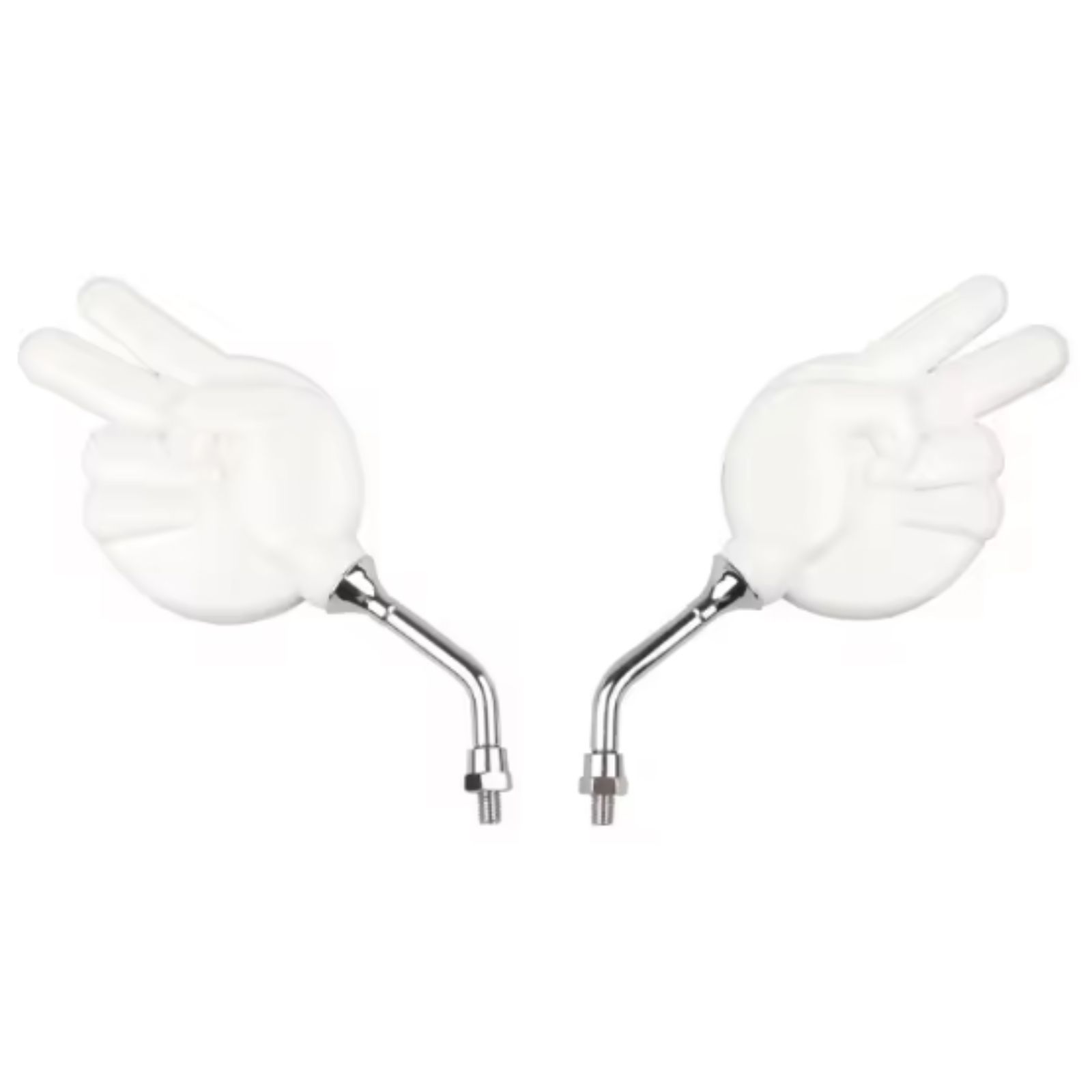 【特長】 「チョキ」の手の形をしたユニークなデザインミラー、左右セットです。明るいホワイトカラーで、原付やスクーターのカスタムにぴったりです。ネジ径は一般的な原付サイズの8mm正ネジ仕様です。他の人とは違う個性的なミラーをお探しの方におすすめです。
