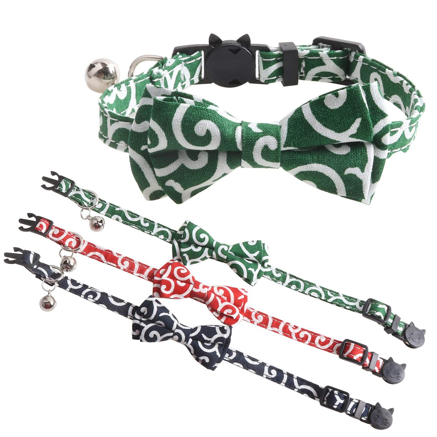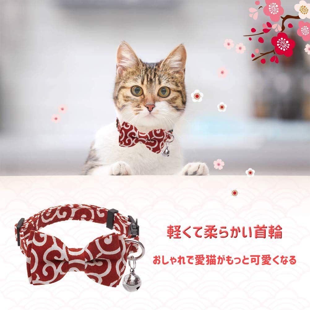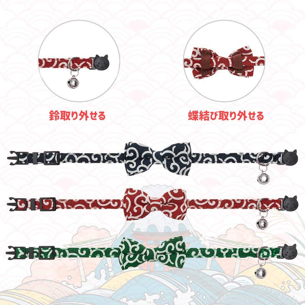 【素材とカラー】素材は耐久性のある布生地で柔らかくとても軽いから、猫ちゃんに優しいです、柄は唐草でオシャレで可愛いです。カラー:ネイビー、レッド、グリーン。パッキングリスト:グリーン猫首輪1個、迷子札1個、FUWAPETブランドタグ