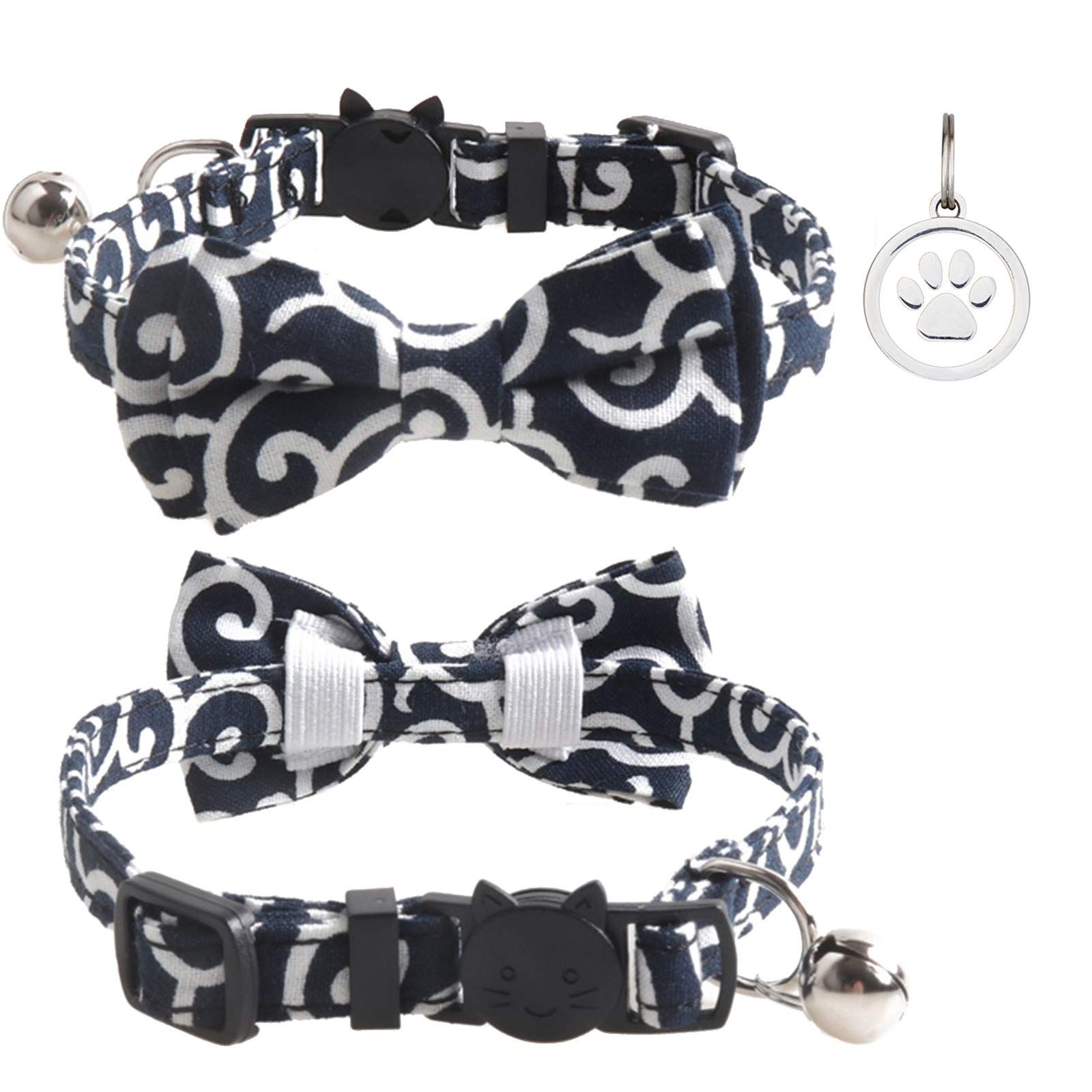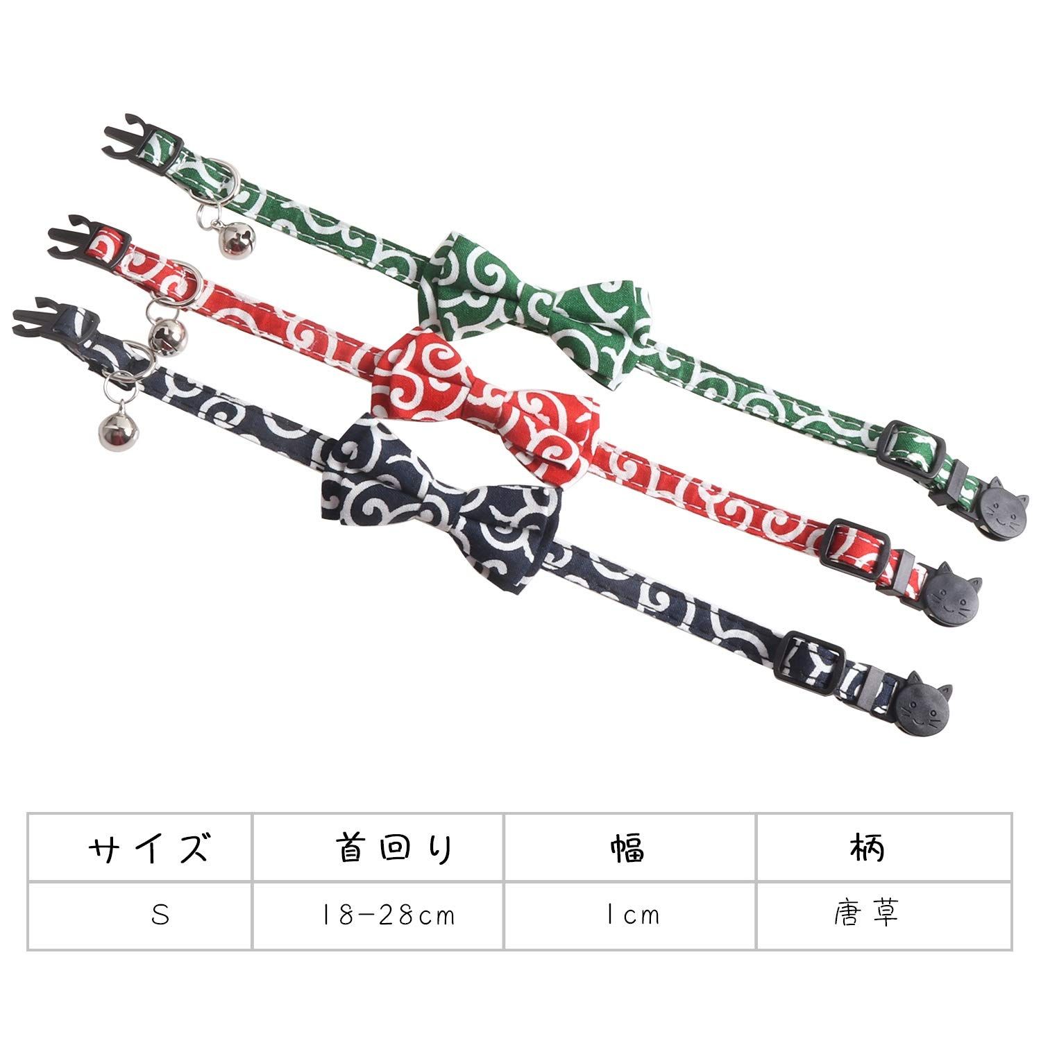 猫首輪 猫用 首輪 子犬 迷子札付き リボン付き 鈴付き 蝶結び付き 調整可能 可愛い 軽量 ペット首輪 セーフティバックル付 布 和風 唐草 ネイビー 1個入り