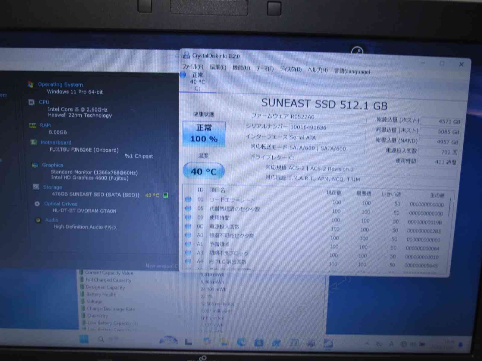バッテリー状態:新品時と比較して22%の性能(BatteryInfoViewで表示された参考値であり実際の容量・充電可否は保証対象外)