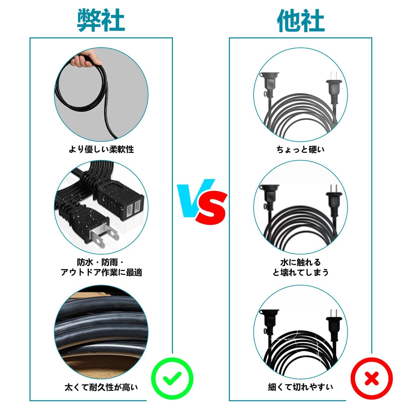【より優れた柔軟性】延長線の外側にはシリカゲルを添加した材質があるので、防水 延長コード 屋外の使い心地がより柔らかくなるので、使い終わった後も収納しやすい。適度な柔軟さがあるので一般の延長コードとしての使用も可能です。