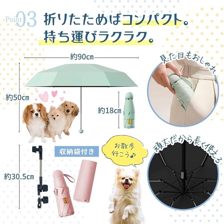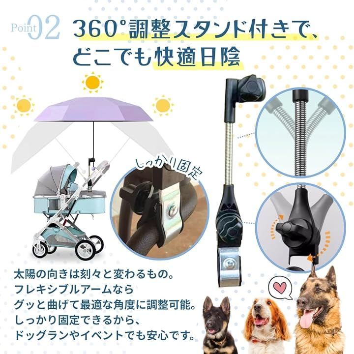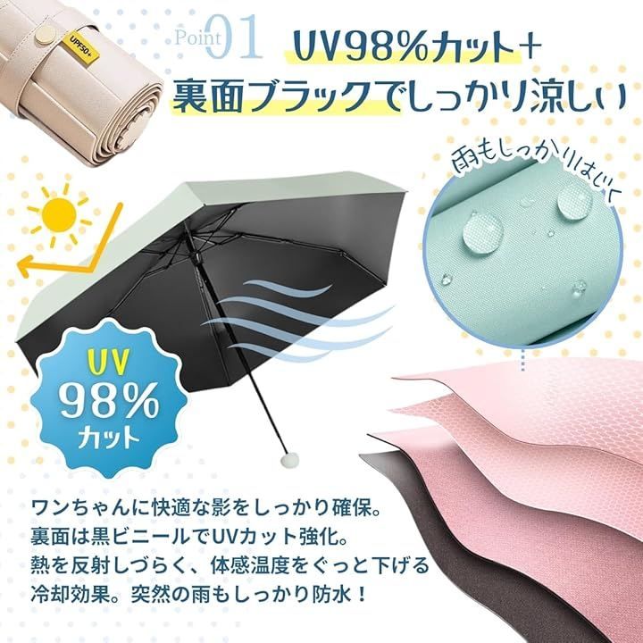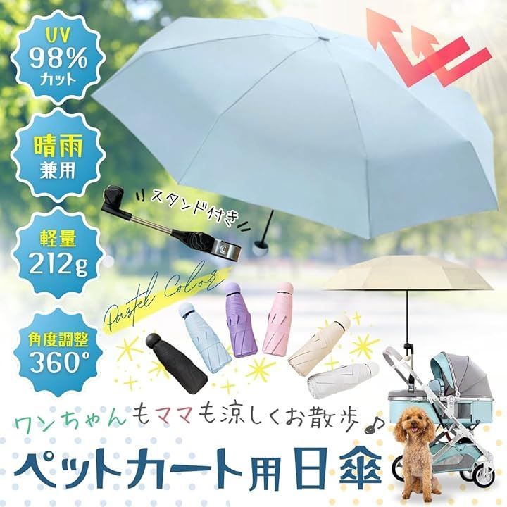 「商品詳細」セット内容:晴雨兼用日傘+スタンド(フレキシブルアーム、約30.5cm)サイズ:[使用時]約90x50cm [収納時]約18cm UVカット率:98%(裏面ブラック加工)重さ:約212g 特長:防水仕様/360°角度調整/しっかり固定スタンド/通気性確保/熱中症対策 カラー:ブラック・ピンク・ライトグリーン