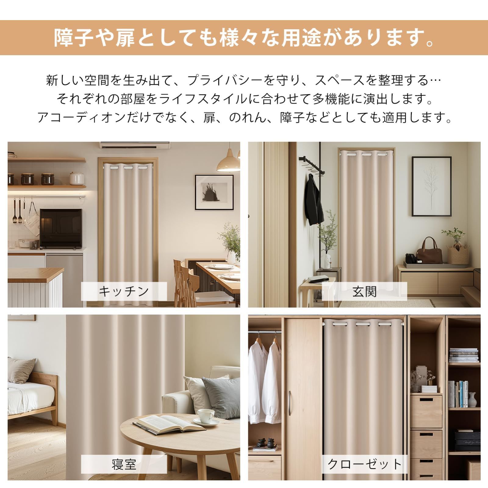 【仕様】:フックなどは不要です。ハトメに一般的な突っ張り棒を通すだけで簡単に設置できるのれん。使用しない時はたたんでおけますので通り抜けの邪魔になりません。