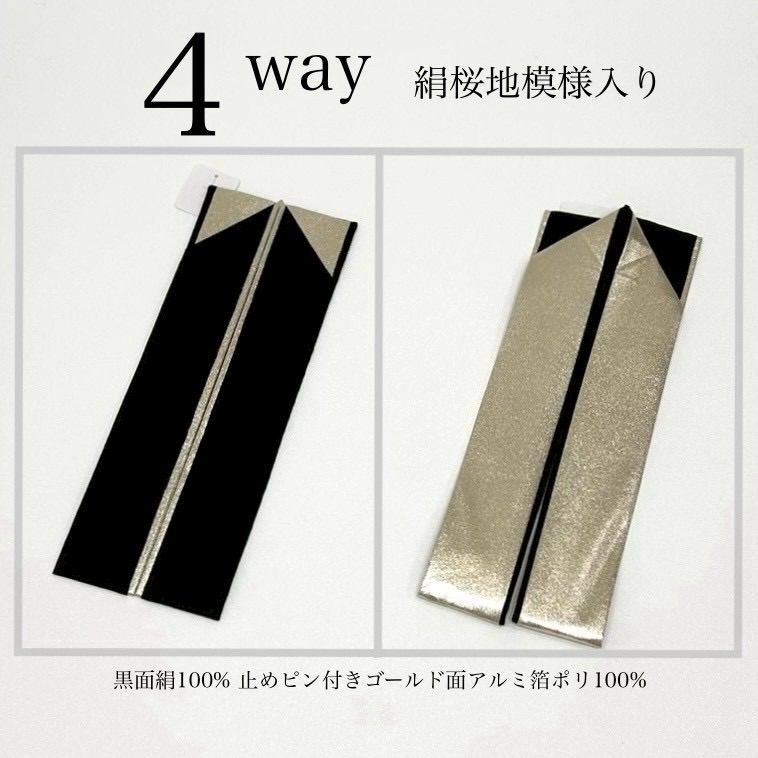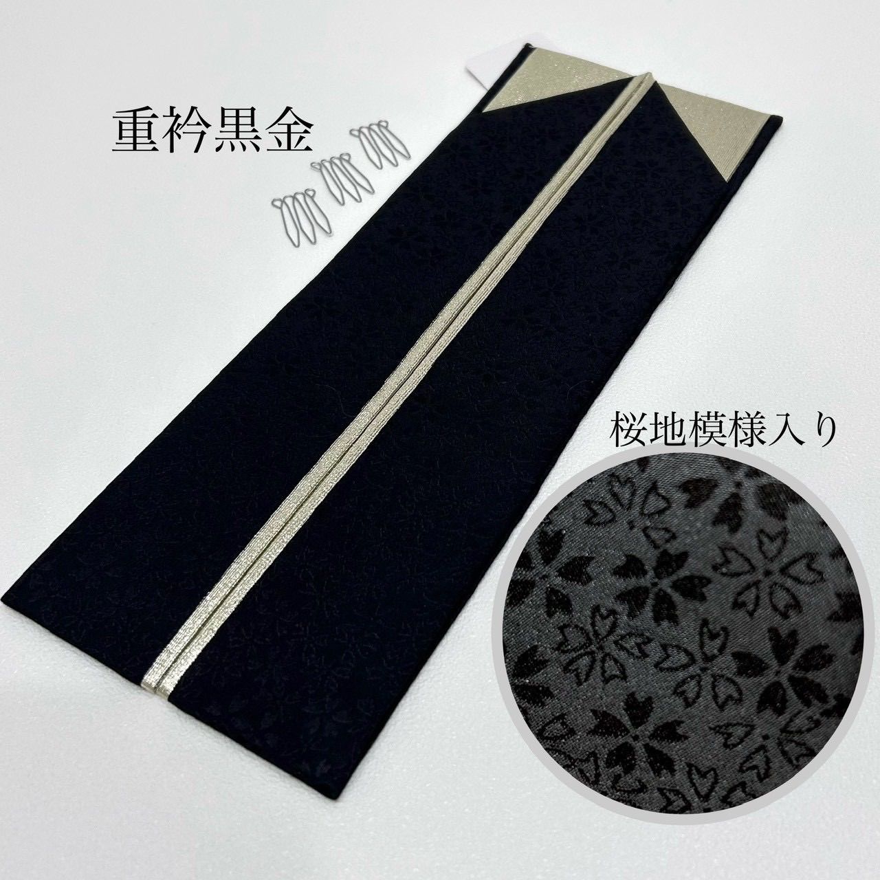 両面リバーシブル、1本で黒金・金黒・黒単色・金単色の4通りでお使いいただけます。バチ衿で通常の重ね衿のサイズ。止めピン付き。小さな華模様が地模様に織り込まれ綺麗な重衿(伊達えり)絹で着物にも沿いやすく、かさばらず衿元を上品に華やかに。