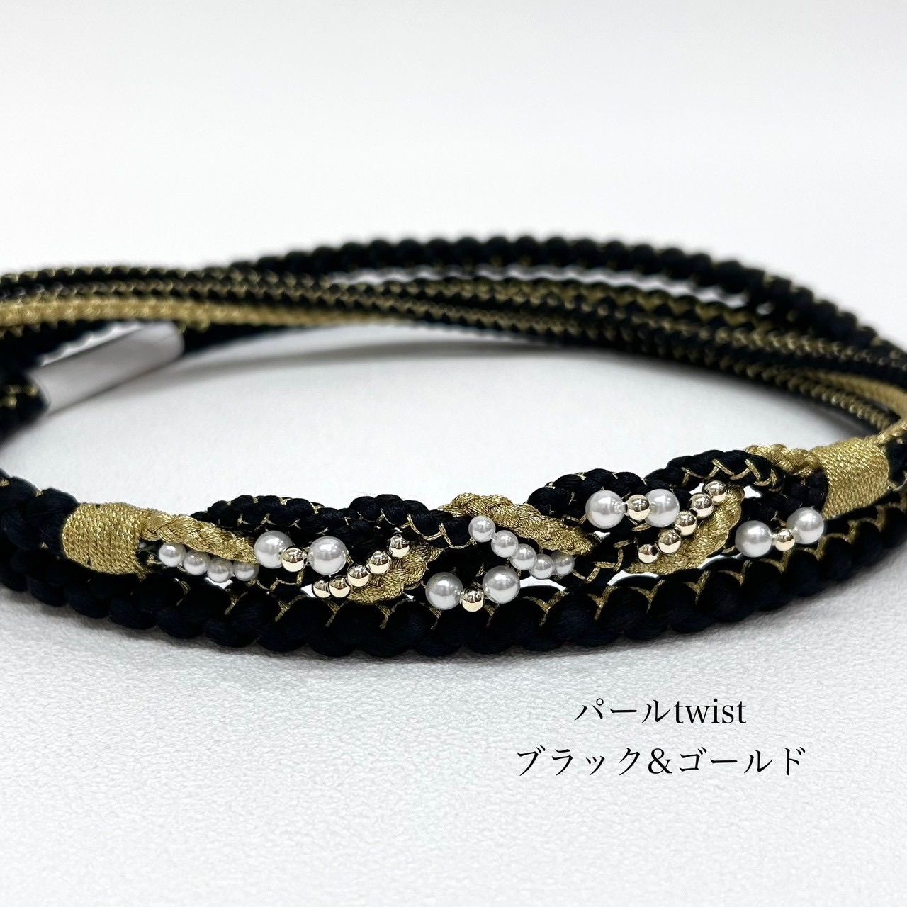 今流行り人気の黒、組紐に大小のパールとゴールドのビーズの編み込み。先端は4本のアレンジタイプ。
