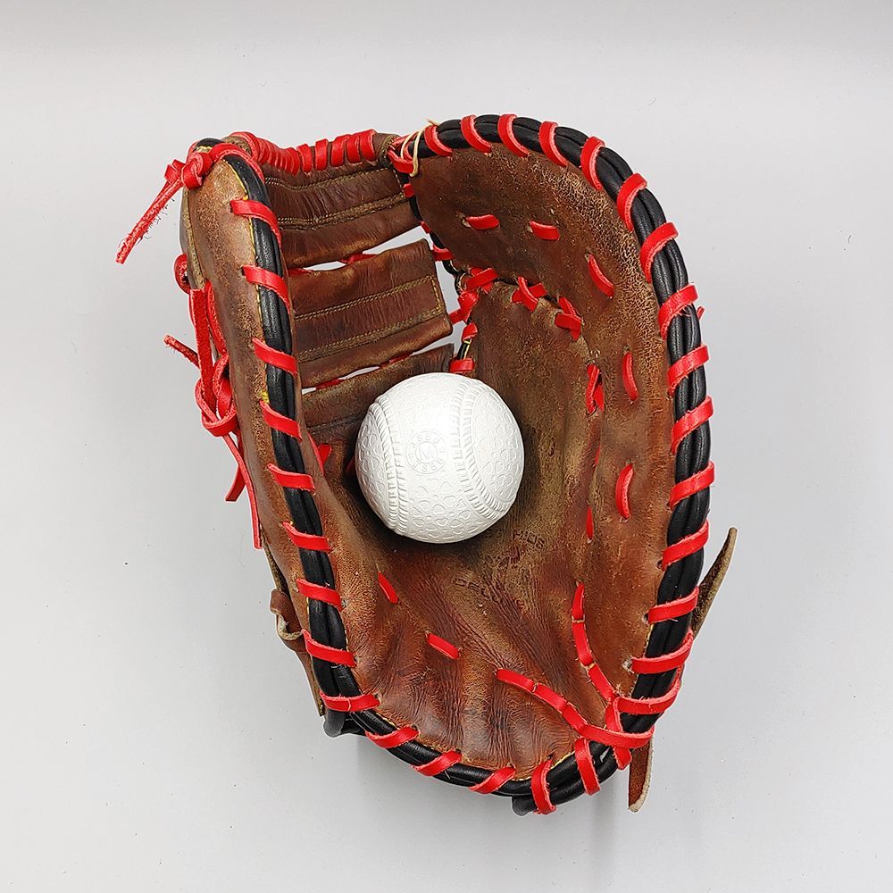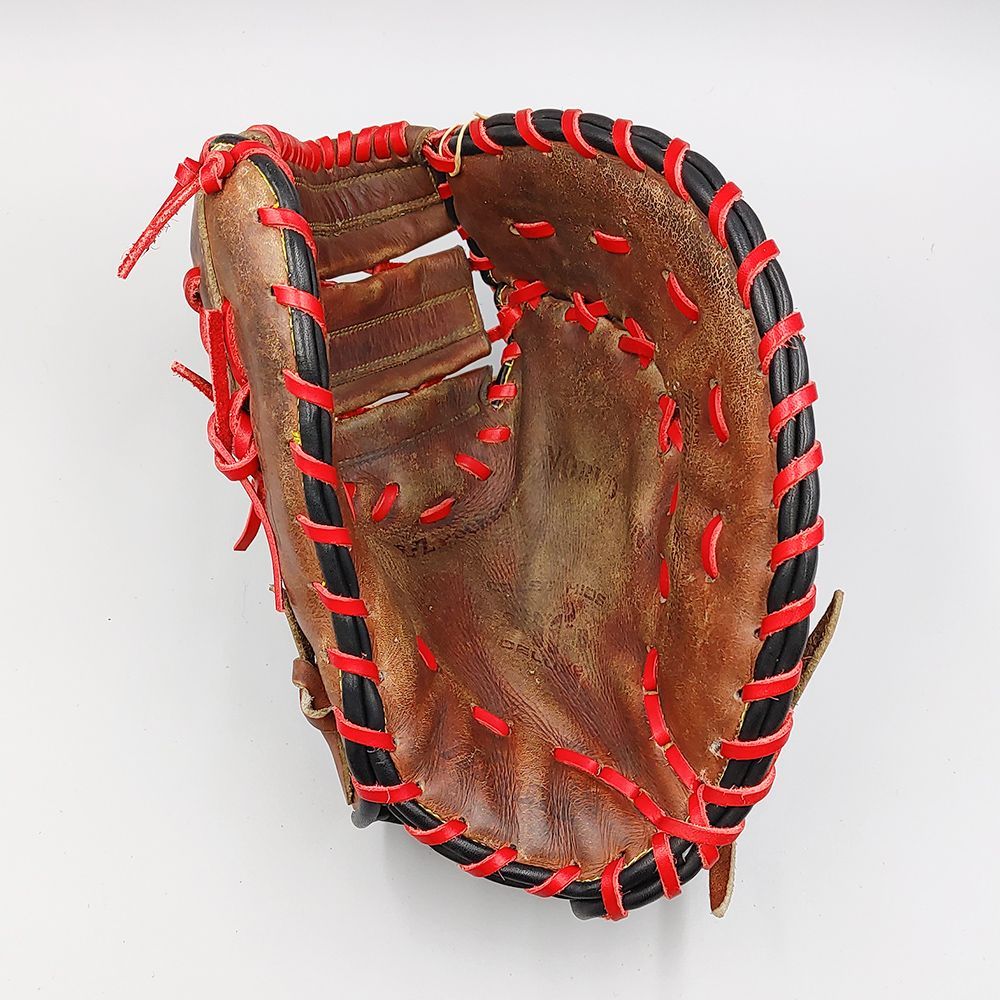 レッドの紐とブラックのヘリ革を合わせた個性的なデザインのミット。紐とヘリ革を新品に交換していますのでグローブ全体にハリも戻っている状態です。