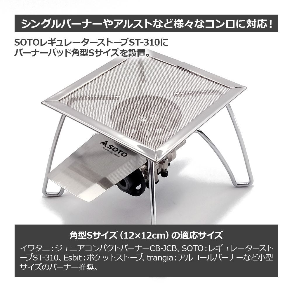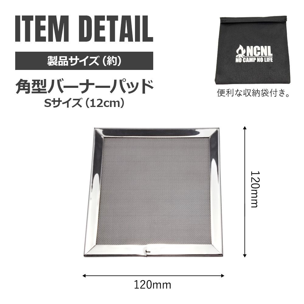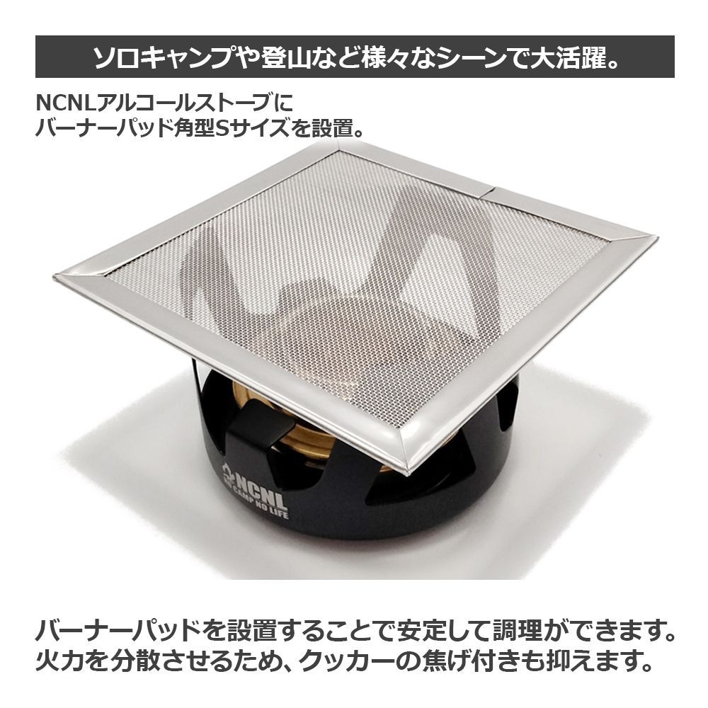 バーナーパットは加熱を均等することと、シングルバーナー、アルコールストーブ、ポケットストーブなどの各種ストーブの五徳とクッカーとの接触面を平面にすることができるので調理などの作業をより安定にし、滑り止めにもなります。網が加熱されると遠赤外線を発生させるので寒い時はパットに火を当てることで遠赤外線ヒーターとして暖を取ることもできます。