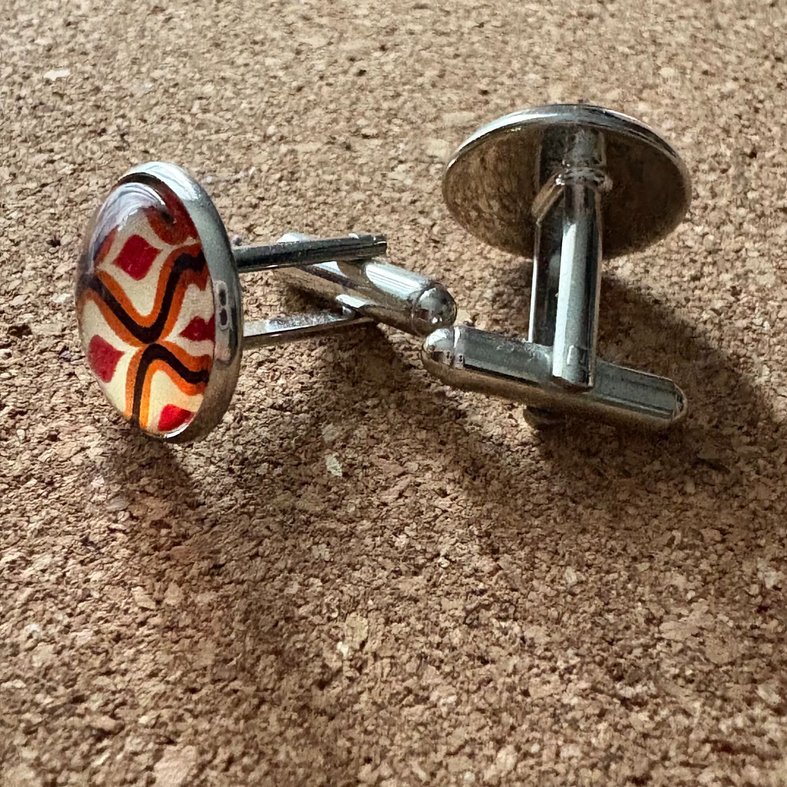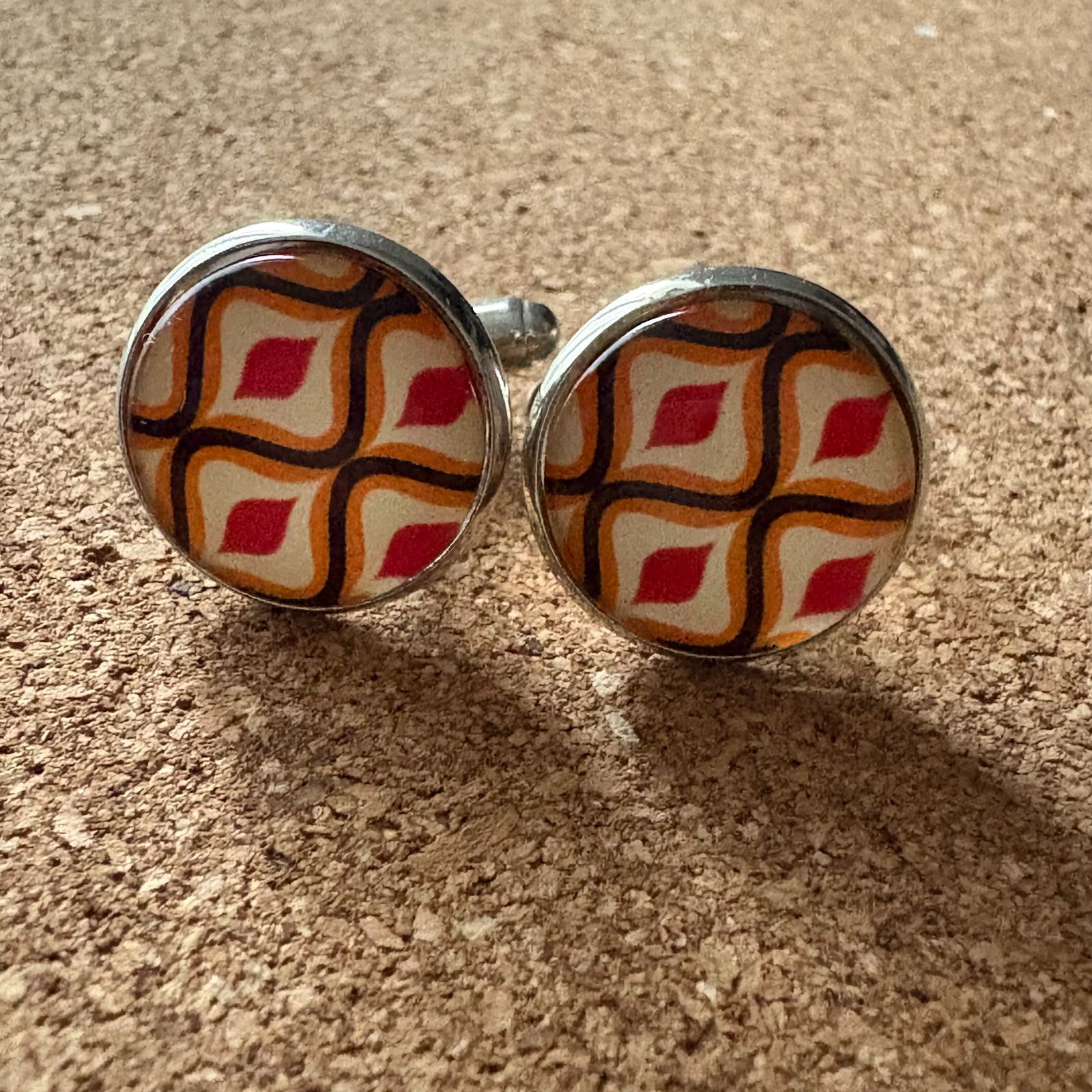 ノスタルジックな暖色: 鮮やかなレッド、ウォームオレンジ、シックなブラウンが、アイボリーの背景に美しく配置されたレトロな幾何学模様です。1960年代や1970年代のポップでノスタルジックな雰囲気を袖口に再現します。