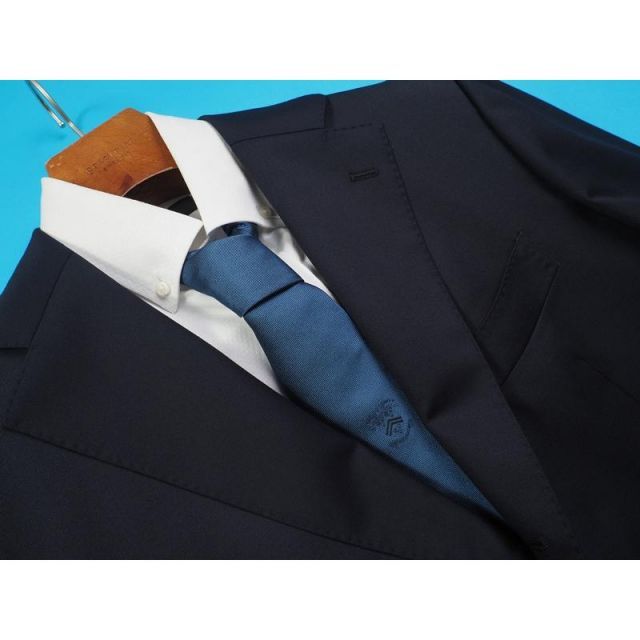 元々大手スーツ専門店向けでOEM生産されたお品ですが、余剰生産等の理由で納入されず、ブランドロゴ等をはがして流通させているお品になります。裏地にロゴをはがした軽微な針穴がある以外は市販品と全く同じクオリティで製造されております。高価格帯ラインのお品のため、お台場仕立て、水牛ボタン、本切羽、AMFステッチなどの上級仕立てで仕上げられております。