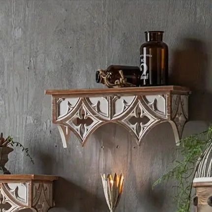 ウォールシェルフは、スタイリッシュなインテリアを求める方にぴったりのアイテムです。ヴィンテージとアンティーク調のデザインが融合した美しい仕上がりで、どんなお部屋の雰囲気にも調和します。木製の素材感が温もりを与え、リビングやダイニングルームなどさまざまなシーンで役立つこと間違いなし。飾るだけでなく、実用性も兼ね備えた装飾棚として、うまくスペースを活用し、思い出の品や好きな雑貨を魅力的にディスプレイできます。