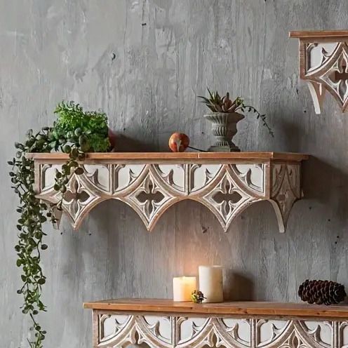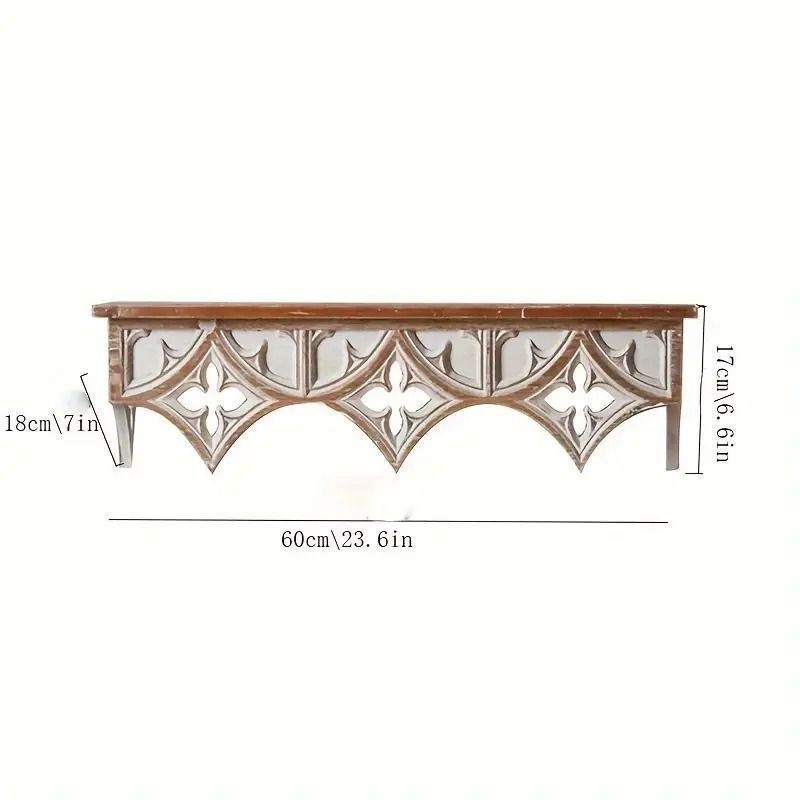 ウォールシェルフは、スタイリッシュなインテリアを求める方にぴったりのアイテムです。ヴィンテージとアンティーク調のデザインが融合した美しい仕上がりで、どんなお部屋の雰囲気にも調和します。木製の素材感が温もりを与え、リビングやダイニングルームなどさまざまなシーンで役立つこと間違いなし。飾るだけでなく、実用性も兼ね備えた装飾棚として、うまくスペースを活用し、思い出の品や好きな雑貨を魅力的にディスプレイできます。