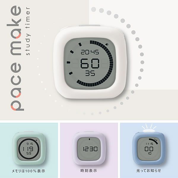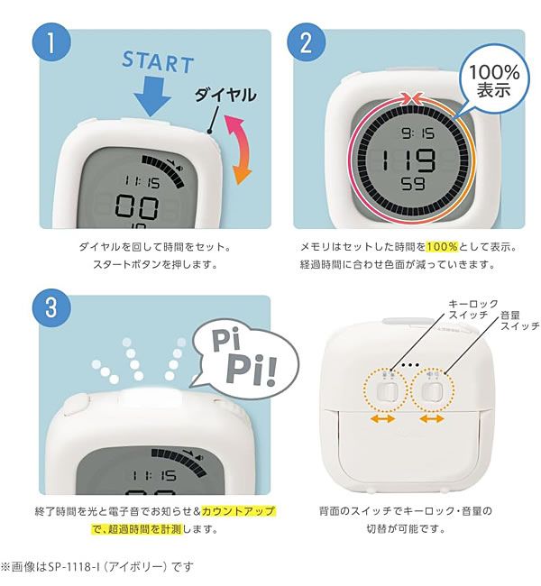 終了時の「ピピピピッ♪」の電子音はON/OFF設定が可能。光ってお知らせ機能で図書館や塾など静かな場所でも使用できます。
