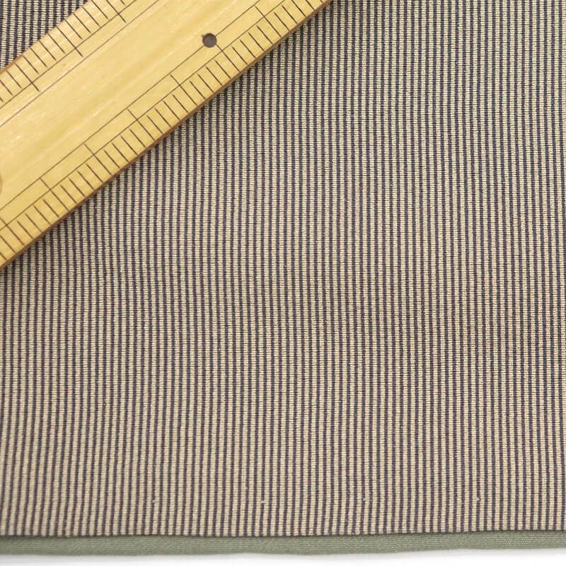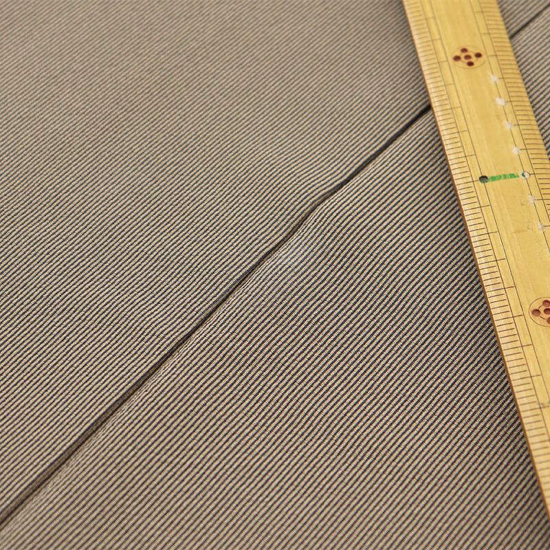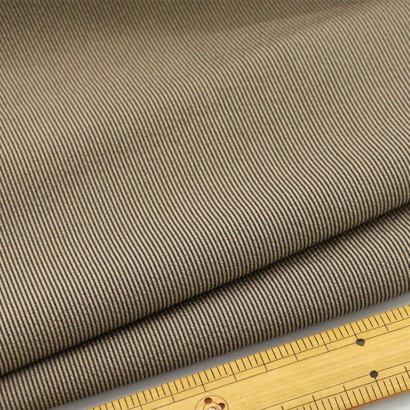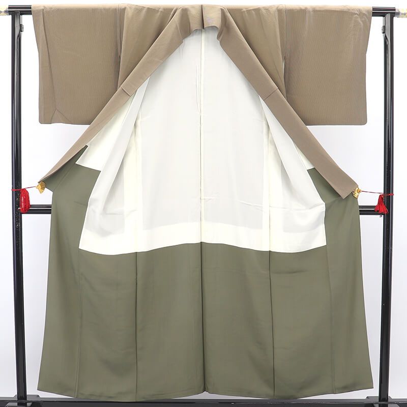 柔らかな薄茶色の地に、こげ茶の縞の万筋小紋です。八掛は渋めの抹茶色で、シックな雰囲気が魅力です。落ち着きのある大人の装いにピッタリなお着物です。