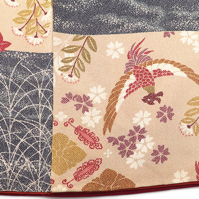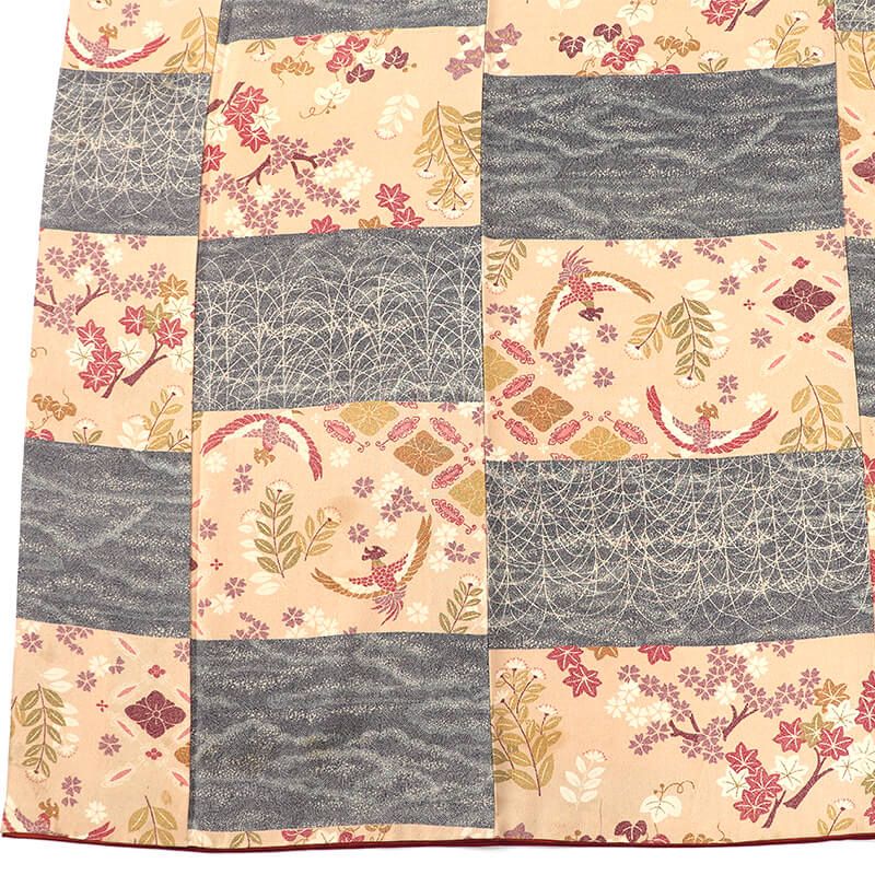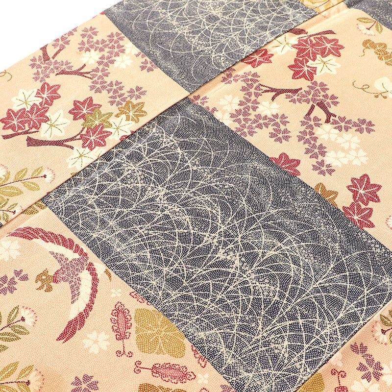 紺にピンクみのあるベージュの段々柄の小紋です。鮫小紋のような雰囲気の柄が、地に入っております。 鳳凰、楓、ススキのような柄が表現され、 柄の多めの和の雰囲気漂う小紋です。 大人の女性も楽しめる落ち着きのある色合いなので、 幅広い世代の方にお楽しみいただけます。 八掛は、薄赤茶色です。