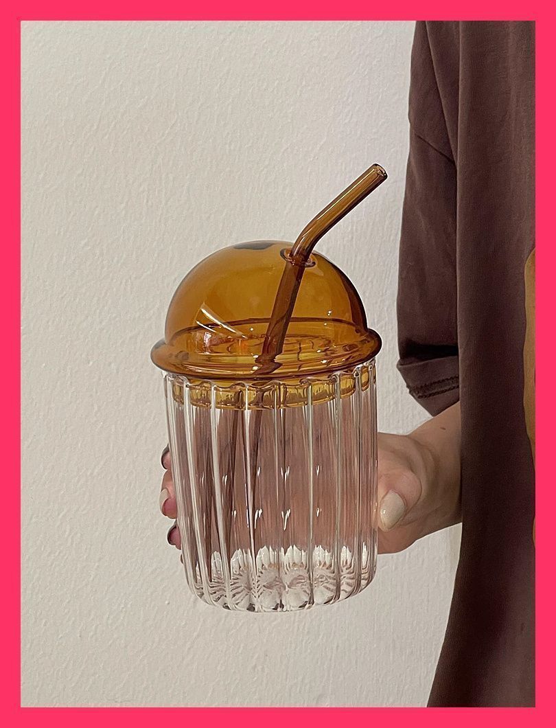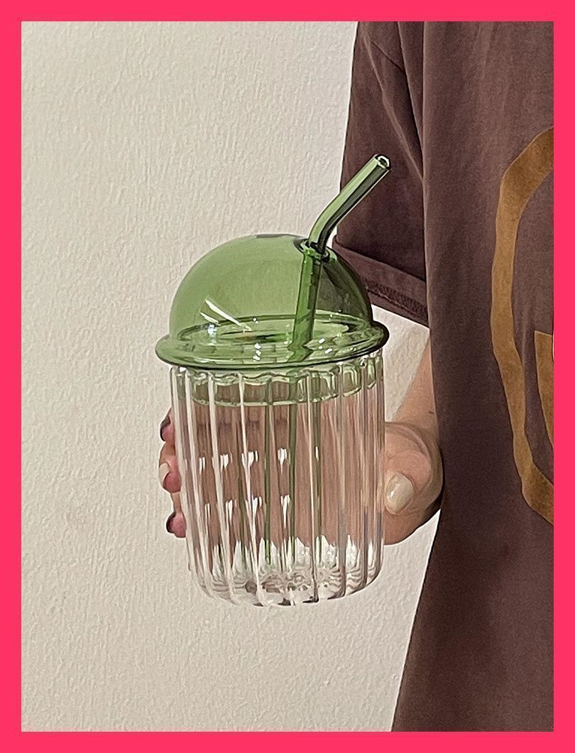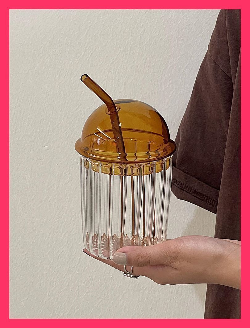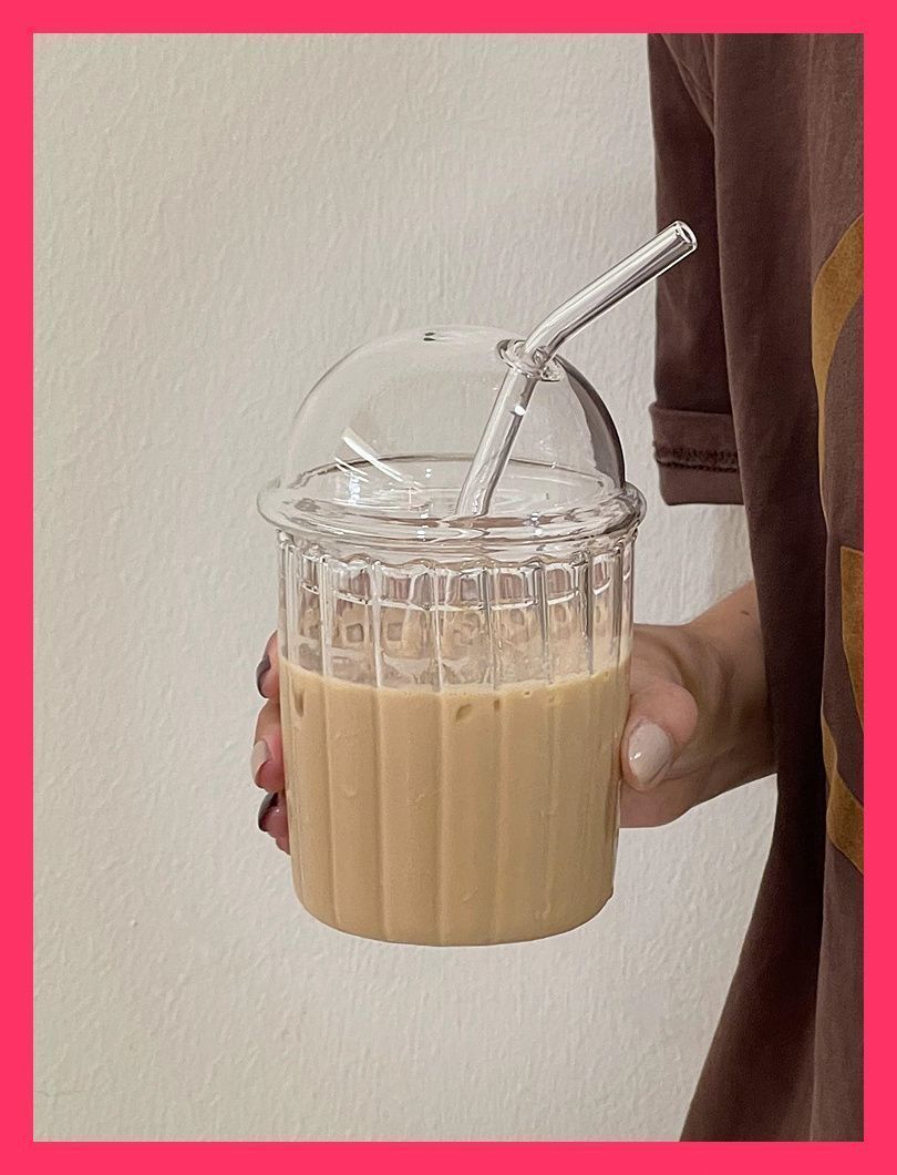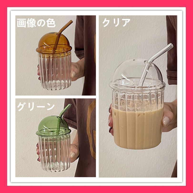 ストライプ ガラス ストローカップ 耐熱 コーヒーカップ 可愛い 蓋付き ジュース 気泡水カップ