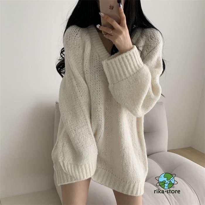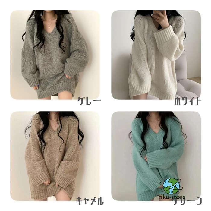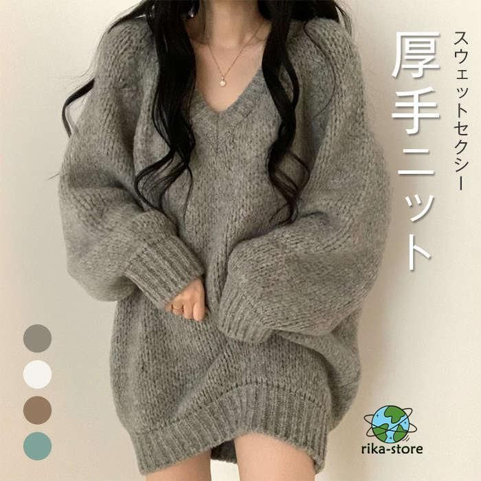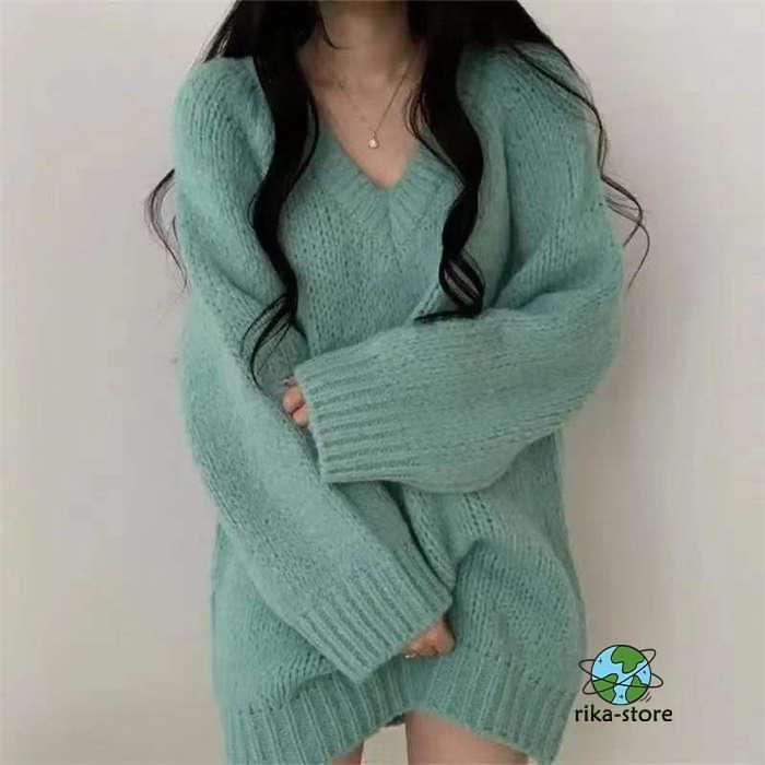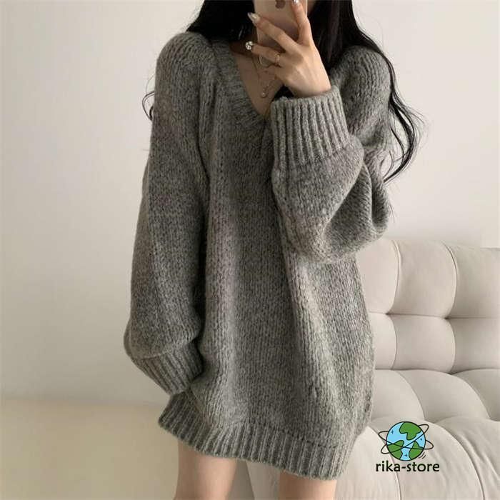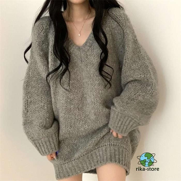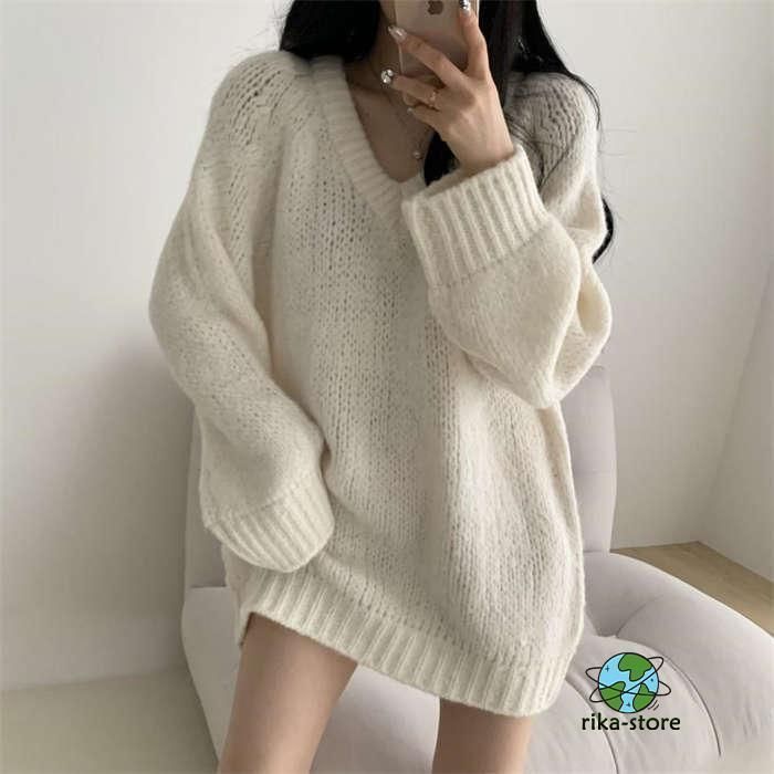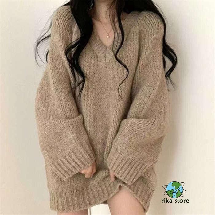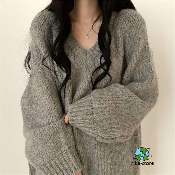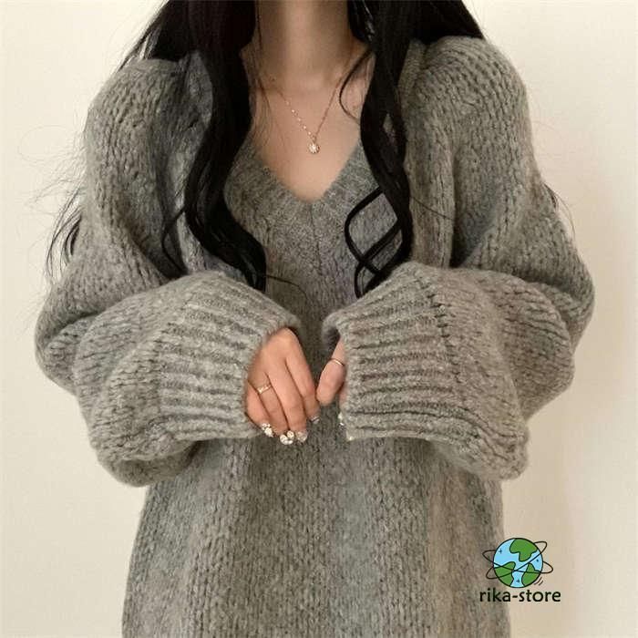 セーター レディース ニット 秋冬 厚手 長袖 オーバーサイズ ゆったり プルオーバー ニットセーター ロングセーター Vネックチュニック ワ