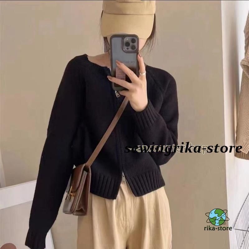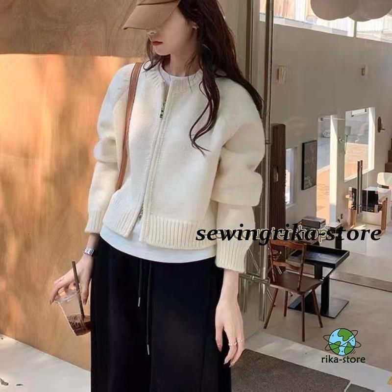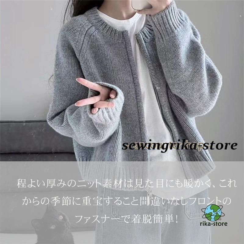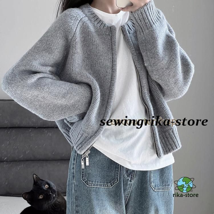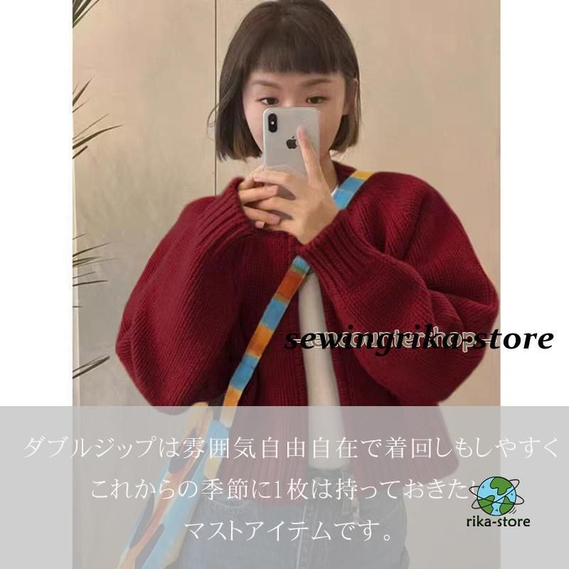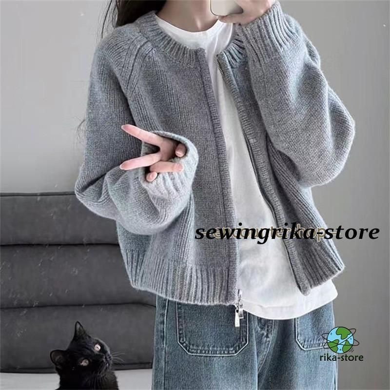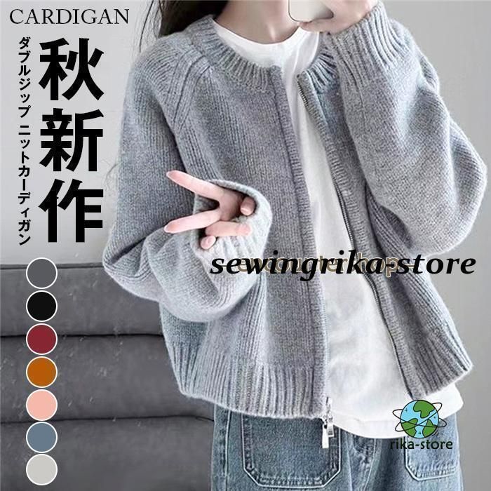アウター レディース カーディガン ニットセーター トップス 秋冬 長袖 ラウンドネック ニット 厚手 ファスナー ダブルジップ ショート カジュアル ファスナー開閉