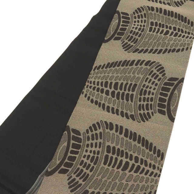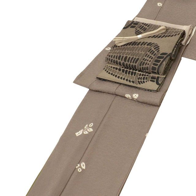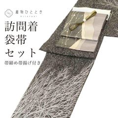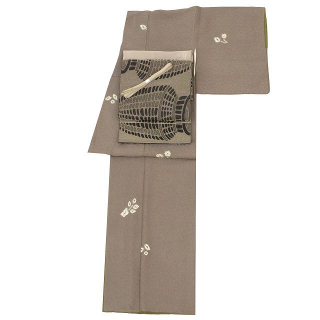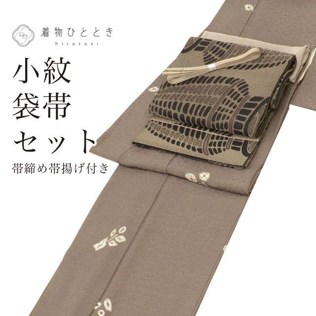 濃いグレー色に植物文様があしらわれたお洒落なりサイクル小紋と黒色地に器物文様が施された袋帯のセットです。